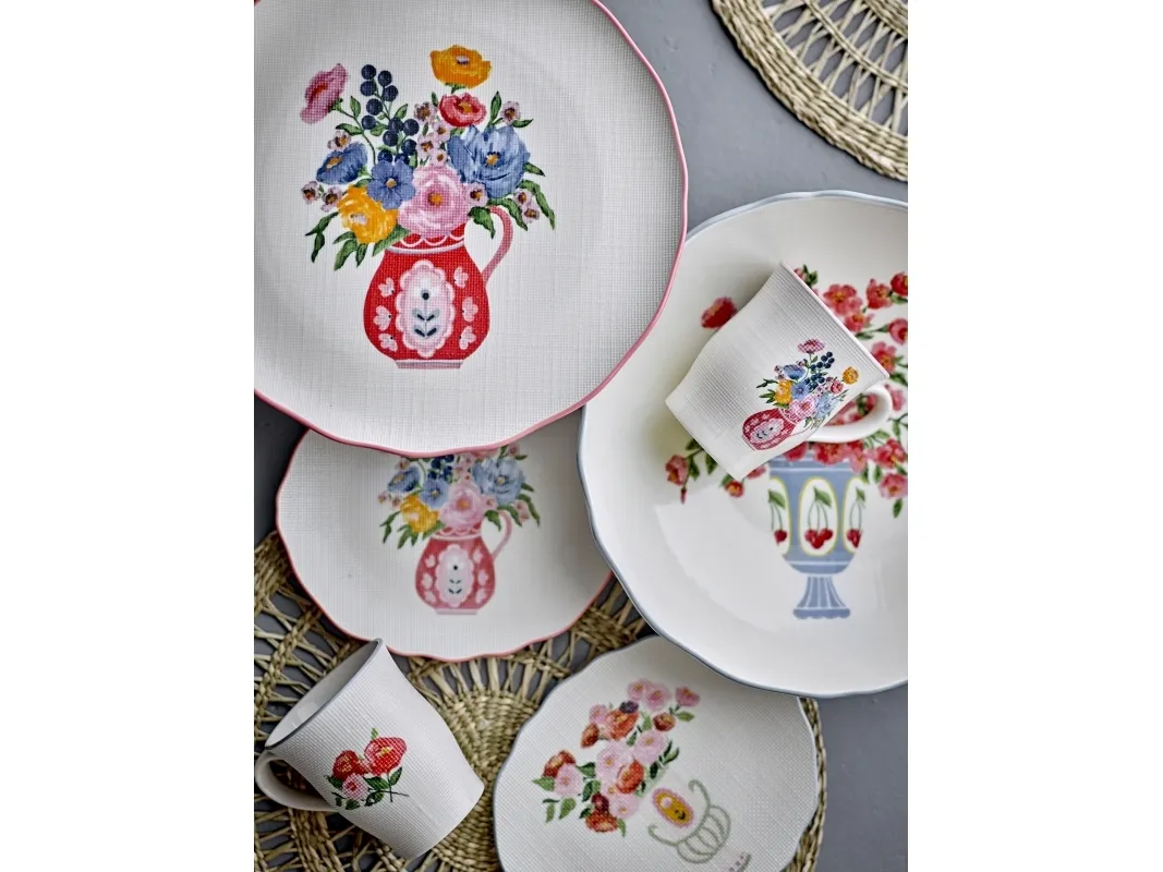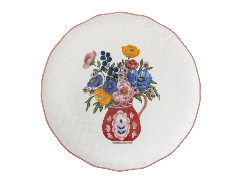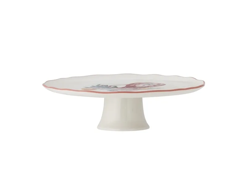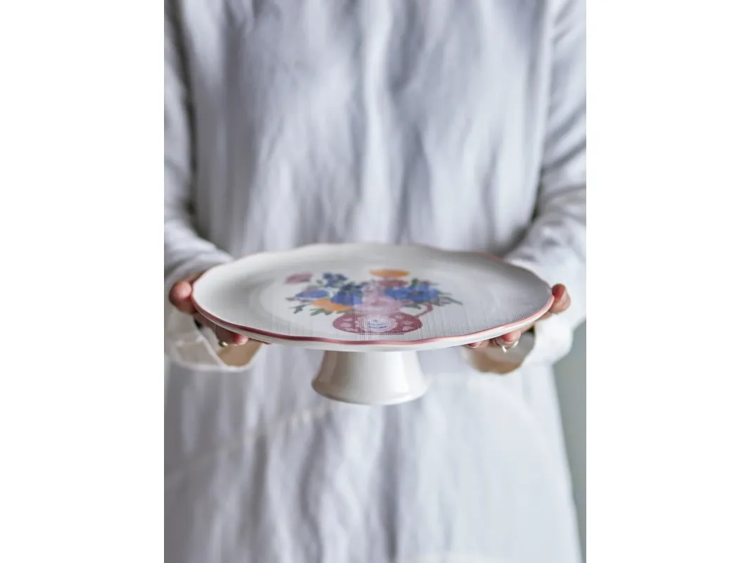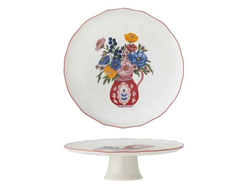 The Dorothy Cake Tray by Bloomingville is an elegant pedestal cake stand adorned with a beautiful embossed floral motif in shades of red, blue, yellow, and green. The intricate pattern, resembling fine embroidery, gives the stand a unique look. This stand is ideal for serving cakes and small dishes.