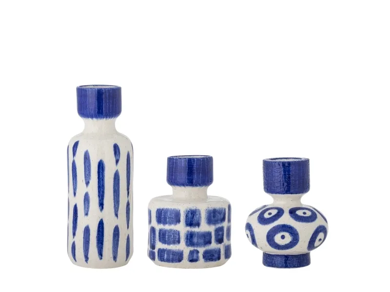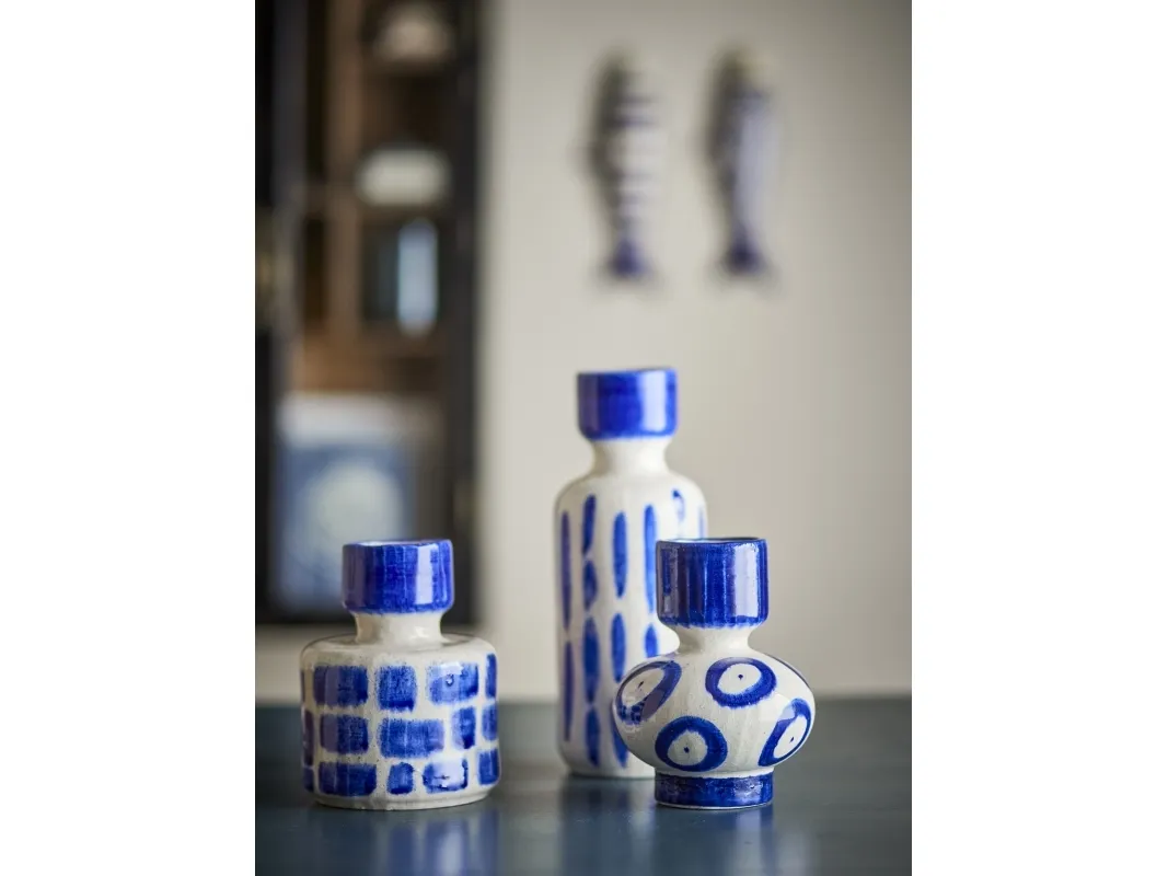 The Romane Vase by Creative Collection is a set of three stoneware vases, each handpainted in varied blue tones. Featuring distinct shapes with vertical strokes, bold rings, and a linear motif. Small variations in pattern and color intensity may occur, making each piece unique.