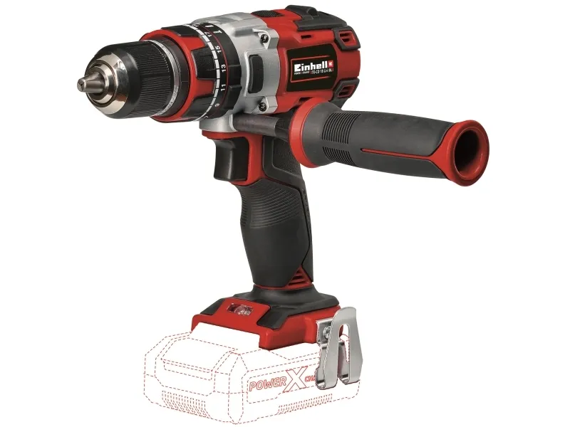 The Einhell Cordless Drill TE-CD 18/50 Li BL Solo is a robust all-rounder for DIY enthusiasts looking to perform work requiring solid performance for quick and exact results without sacrificing comfortable handling. The drill’s brushless motor delivers more power and runs for longer than a conventional carbon brush motor. As a member of the Power X-Change family, the cordless drill is always ready for action – the high-quality lithium ion batteries in the system series resist the self-discharge that is otherwise typical of batteries. In addition, all the battery packs in the system series can be combined with the tool. The cordless drill from Einhell has a 2-speed gearing for fast screwing and powerful drilling. For all the power of the drill, electronic speed control ensures that the right power is delivered for the particular material and application. During drilling, huge forces act on the material, the drill – and of course on the person operating the drill. The ergonomic design and soft grip provide exceptionally easy handling and a firm, secure grip. The LED light gives you a good view of what you are doing when visibility is poor, for example at building sites and in sheds or areas that are difficult to access. The rechargeable battery and charger from the Power X-Change system series are available separately, e.g. as a practical starter set.