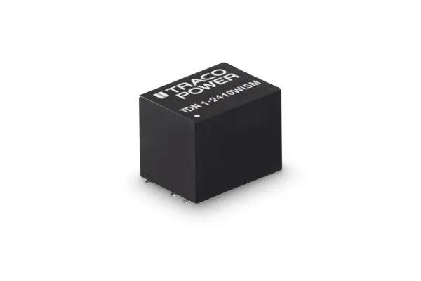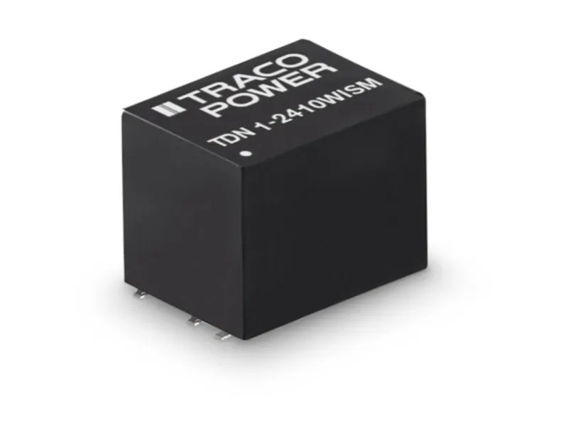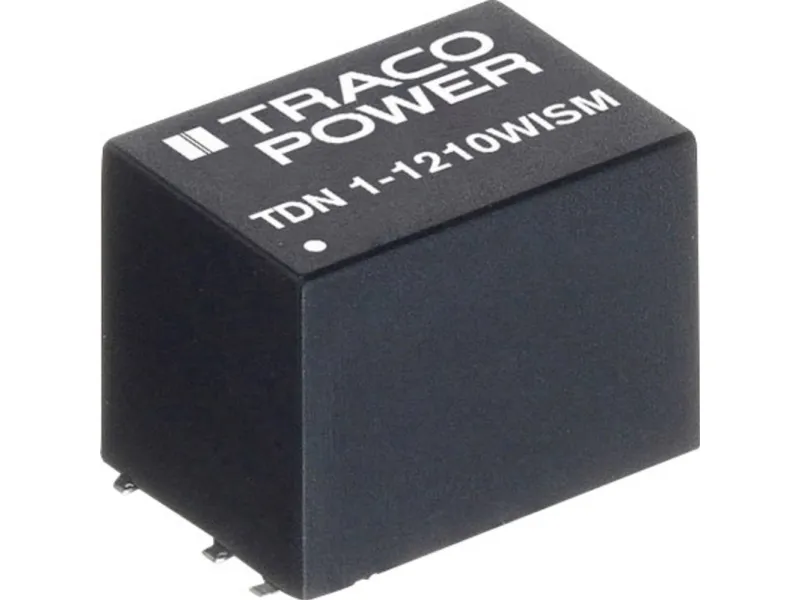 DC/DC-muunnin, TDN 1WISM-sarjaKompakti SMD-kotelo (13,2 mm x 9,1 mm x 10,2 mm), tuloalue 4:1. Tarkasti säädetty lähtöjännite. Jatkuva oikosulkusuojaus, ulkoinen on/off.
