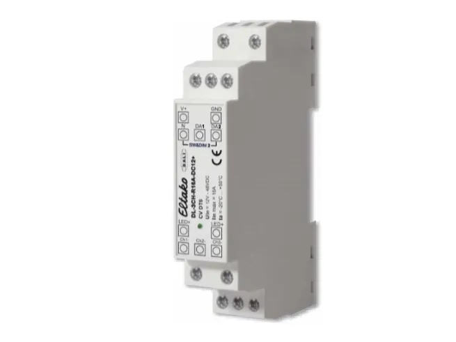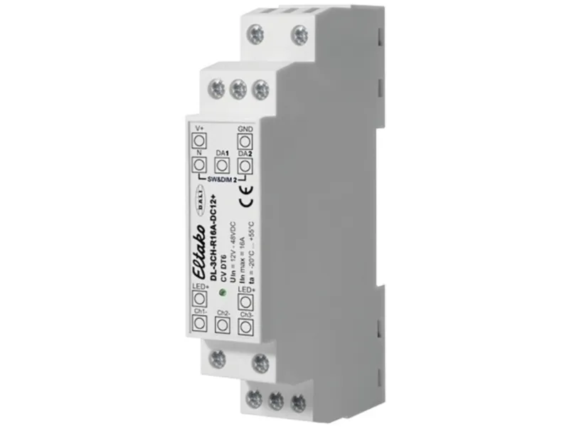 3-kanals DALI-LED-dæmper 16 A til din-skinne3-kanals DALI-LED-lysdæmper til bæreskinne din-en 60715 TH35. Standby-tab kun 0,12 watt. Egnet til aktivering af LED-moduler med konstant spænding (CV) med driftsspænding fra 12 V til 48 V. Driftstype DT6: Separat styring af kanalerne via 3 DALI-adresser. Colour&Dim: Styring via 2 DALI-adresser, som kan bruges til at justere lysstyrken og en til at justere farven. SwitchDim2: Drift via 2 tamindgange muliggør styring af lysstyrke og farve uden DALI. Dæmpningsområde 0.1%-100%. Indstillelig PWM-frekvens (122Hz/244Hz/ 488Hz/ 976Hz). Forsyningsspænding fra 12 V til 48 V DC (svarende til LED-modulets driftsspænding). Tilslutningsstrøm 16 A. Den maksimale tilslutningsstrøm kan fordeles vilkårligt på kanalerne. Høj virkningsgrad. Konfiguration via pc-software DALI-cockpit og DALI-USB-interface. Driftstilstande: Apparatet har flere tilstande: DT6 (leveringstilstand): I denne tilst