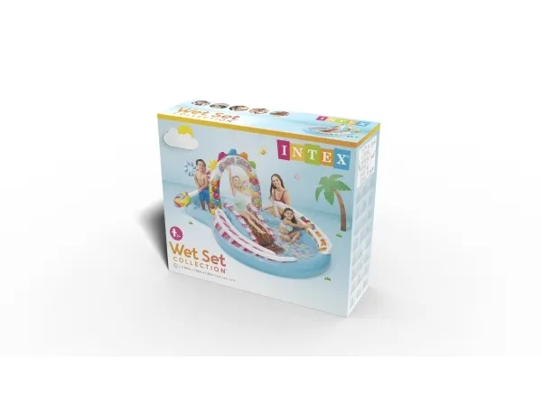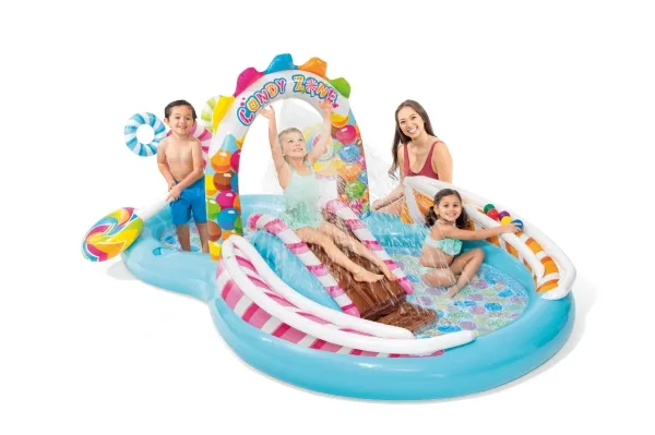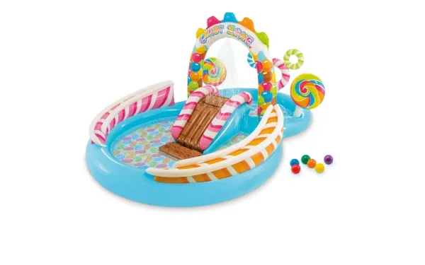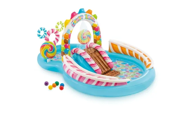 Candy themed play pool that will be a real treat for kids. This playland will entertain kids for hours on end. It includes a waterslide, 2 giant lollipops and a water spray that attaches to the garden hose to keep kids cool. The playland is in two parts - the small pool fills max 168 litres and the big pool up to 206 litres. Pool dimensions 295 x 191 x 130 cm in total. Includes 1 repair patch. The small pool has age grade 2+ and the big one 3+, under adult supervision.