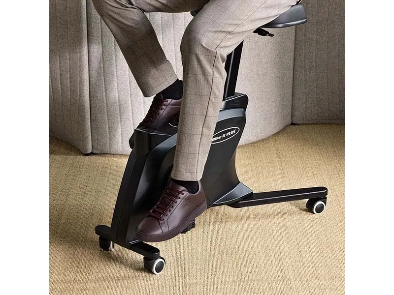 Toimistopyörä Bike it Plus, jossa on hengittävästä verkkokankaasta valmistettu selkänoja, joka takaa sekä mukavuuden että vakauden. Korkeussäädettävä istuin antaa hyvän ja mukavan tuen. Toimistopyörä Bike it Plus mahdollistaa aktiivisen työskentelyasennon vaihtelun. Bike it Plussassa on integroidut pyörät, joiden avulla toimistopyörää on helppo liikutella ympäriinsä - Näin jokaisella on mahdollisuus pyöräillä työpäivän aikana. Pyörät lukkiutuvat kuormattuna, joten se pysyy paikallaan käytön aikana. Toimistopolkupyörä on erittäin hiljainen, joten ympärillä liikkuvat eivät häiriinny. LCD-näyttö, jossa näkyvät kellonaika, nopeus, etäisyys, kalorikulutus ja kierrokset minuutissa (kierrokset/minuutti, kierrokset/minuutti, kierrokset/minuutti, kierrokset/minuutti) Säädettävissä oleva polkimen vastus Helppo liikutella integroidun pyörän ansiosta. Meluisuus: <55 db Väri: Musta