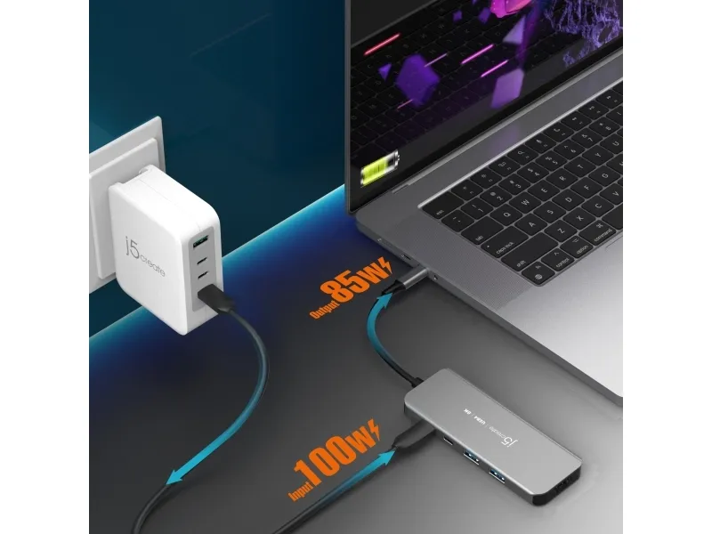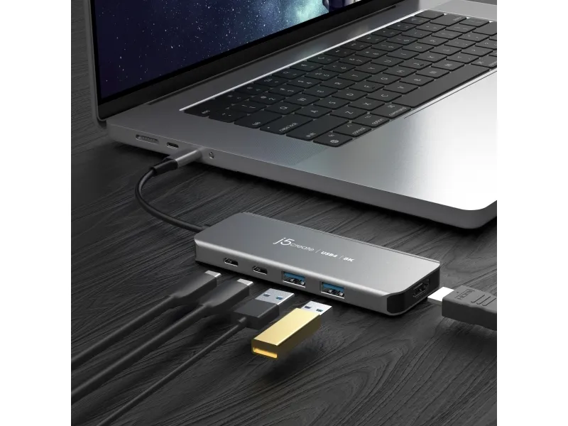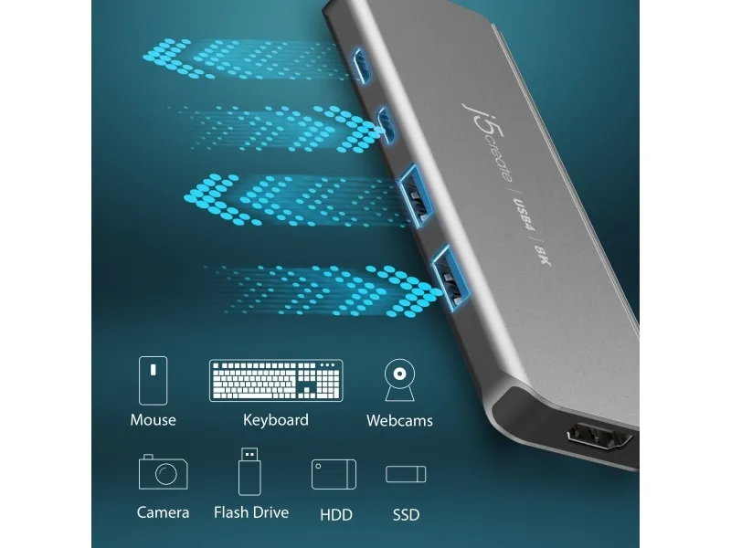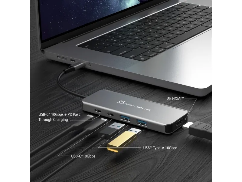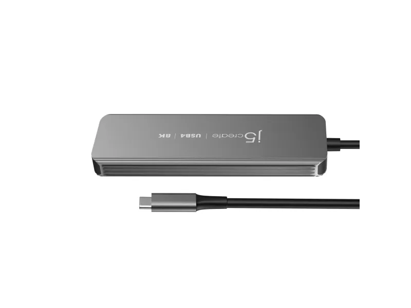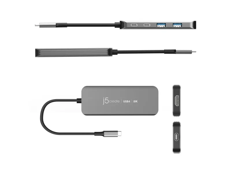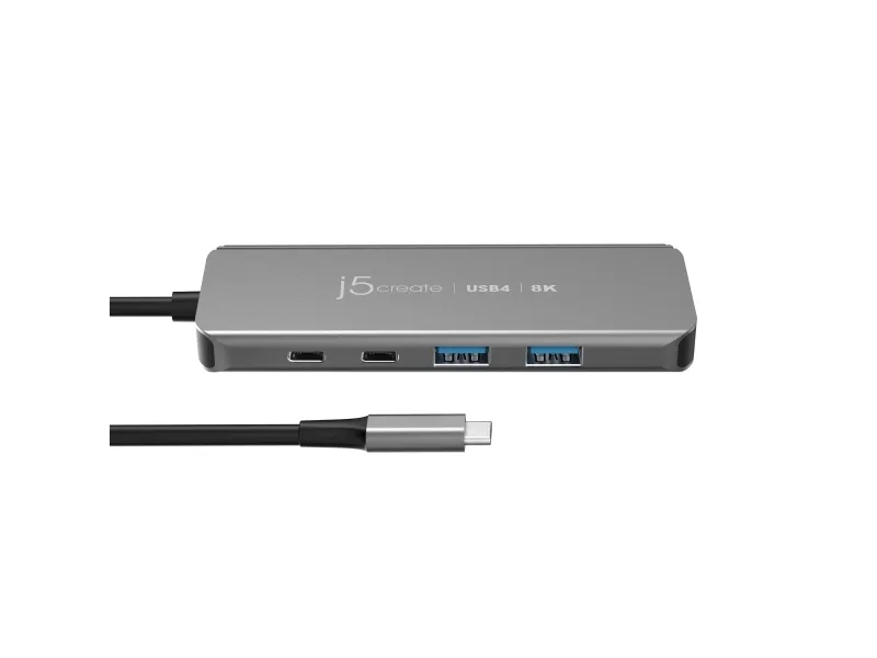 j5create JCH453-N USB4® 8K60 Slim Hub, USB4, HDMI, USB 3.2 Gen 2 (3.1 Gen 2) Type-A, USB 3.2 Gen 2 (3.1 Gen 2) Type-C, USB Type-C, 10000 Mbit/s, 1920 x 1080 (HD 1080), 2560 x 1440, 3840 x 2160, 7680 x 4320, 7680 x 4320 pikseliä, Harmaa