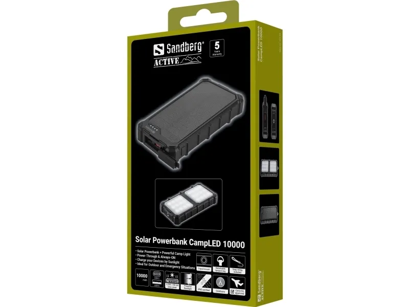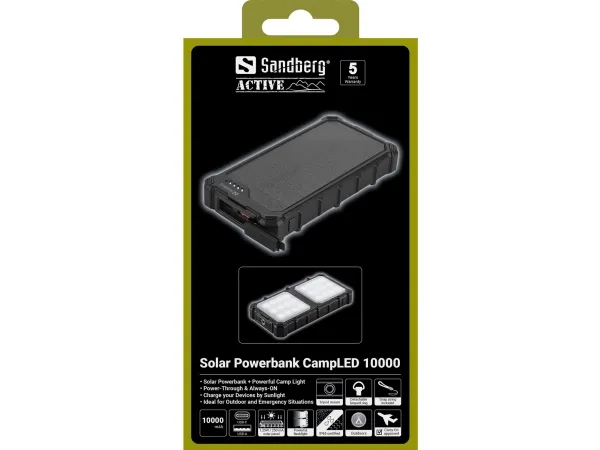 Sandberg Solar Powerbank CampLED 10000 er din trofaste makker, når eventyret kalder – uanset om det er en vandretur i vildmarken, en weekend i telt under stjernerne eller bare hverdagen, hvor strøm ikke altid er lige ved hånden. Den kraftige kapacitet på 10000 mAh giver dig masser af juice til dine enheder, mens det indbyggede solpanel lader dig tanke op direkte fra solen. Powerbanken er robust bygget, vandtæt og klar til at modstå vind, vejr og vilde forhold. Og med den kraftige indbyggede LED-lampe kan du lyse natten op, lave mad i mørket eller finde vej tilbage til teltet.