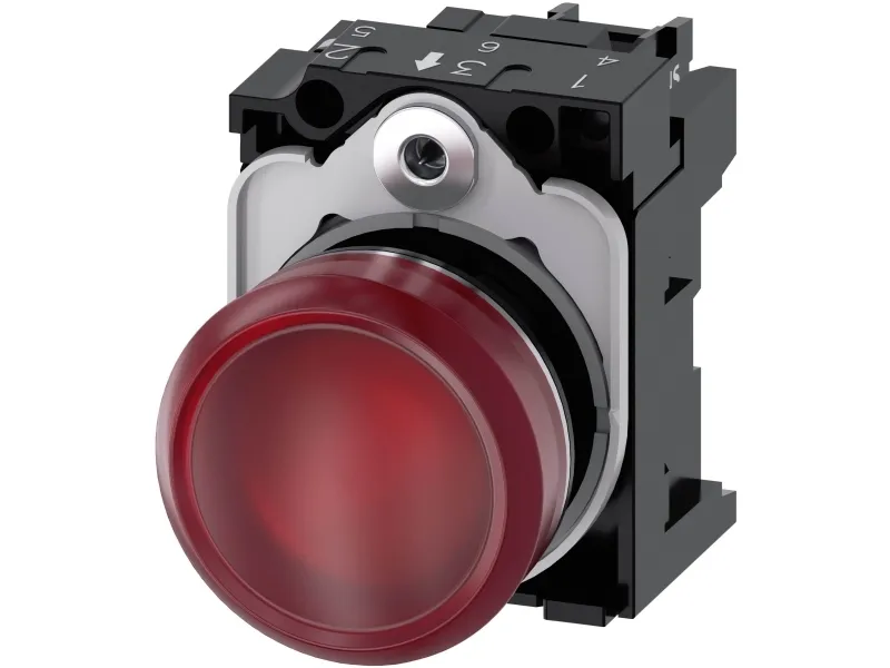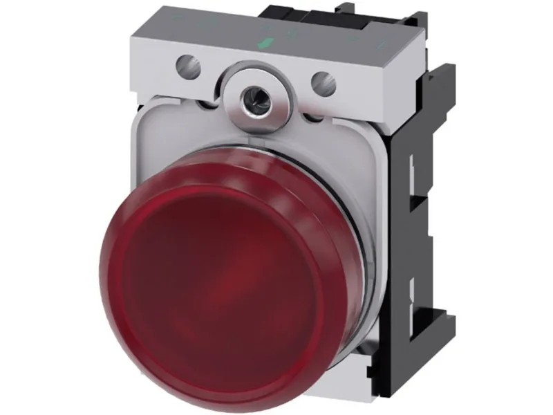 Indicator light, 22 mm, round, metal, high gloss, red, lens, smooth, 230 V AC Indicator lights, 22 mm, round, metal, shiny, red, lens, smooth, with holder, LED module with integrated LED 230 V AC, screw terminal Indicator lights SIRIUS ACT for signaling switching states or faults in systems with high luminosity, thanks to energy-efficient LED technology. Under the brand name SIRIUS ACT, Siemens offers a unique portfolio of pushbuttons and signaling devices with global product approvals in four modern design lines of rugged genuine metal and high-grade plastic. An innovative snap-on concept makes the task of installing a unit so easy that it can be done with one hand and without any special tools. Groove-free holes are adequate as mounting holes since full twist prevention is already integrated. Thanks to the high degree of protection throughout, the rugged devices are suitable for use in industry and outdoors. Even cleaning with a high-pressure jet is possible. Neither dust, oils, nor caustic solutions can interfere with reliable operation. As well as standard wiring, the devices can also be connected to the controller via PROFINET, AS-Interface or IO-Link. Doing so will help you to reduce wiring time and effort, minimize error sources and have more flexibility. The graphical Online Configurator provides convenient support when selecting and ordering individual devices, enclosures and labels. Extensive documentation (e.g. manual, 3D data, terminal diagram) is available. Versions available: Several colors, different voltage variants. Note: Complete unit, delivery includes holders and modules. SIRIUS ACT - Performance in action for control and signalling. Simply mounted, simply strong, simply perfect.