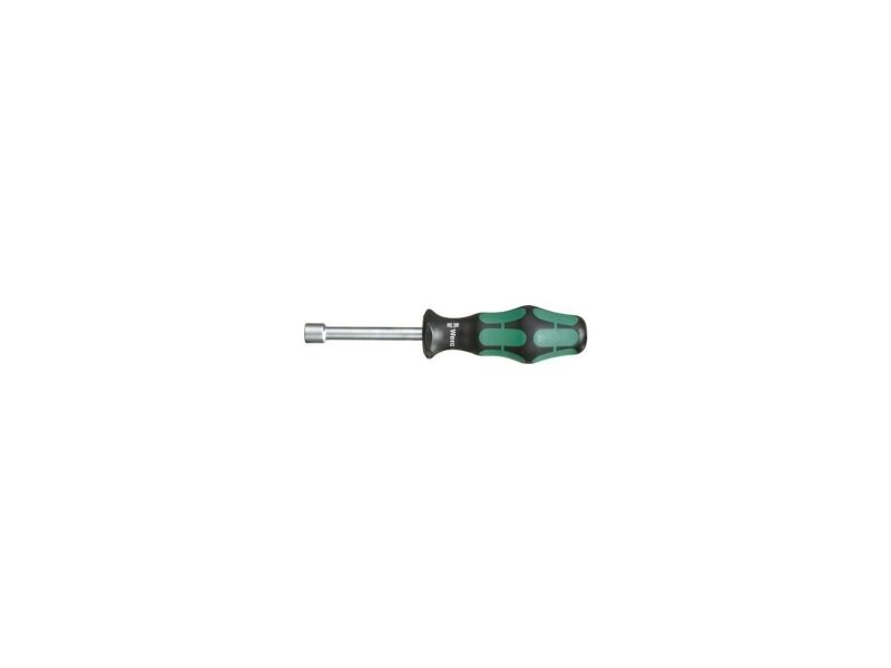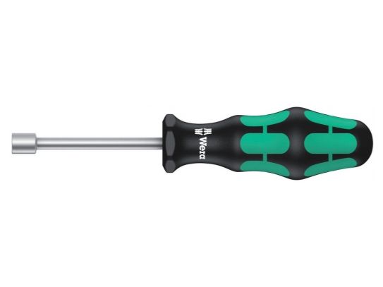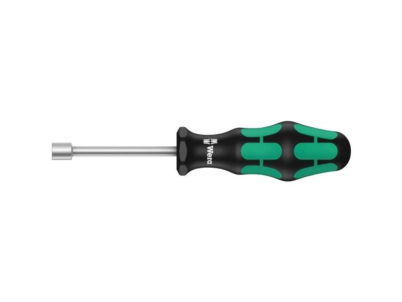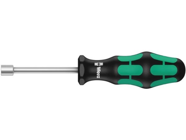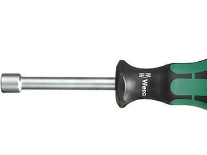 High quality nutsetter with hollow shaft by Wera. Hollow shaft for the fastening of threaded rods; only then can the threaded rod with nut slip into the hollow shaft. Multi-component Kraftform handle for high working speeds and particularly ergonomic screwdriving. Kraftform Plus: hard gripping zones for high working speeds whereas soft zones ensure high torque transfer. Hexagonal anti-roll feature prevents any rolling away and handle markings make for simplified finding and sorting of the tool; for hexagon head screws.