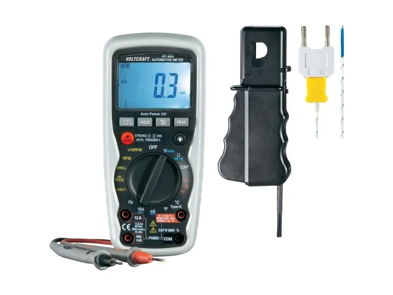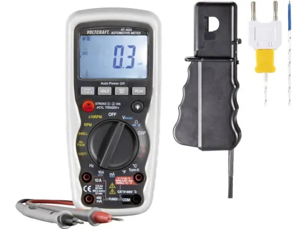 Robust digitalt multimeter med specialmåleintervaller til anvendelse i bilen. Via en induktiv føler kan omdrejningerne måles på motorer med og uden strømfordeler, og slukkevinklerne kan testes. Til temperaturmåling har den en K-typekontaktføler. Til temperaturmålinger af roterende eller spændingsførende dele kan man tilvælge en berøringsfri IR-adapter til temperaturmåling.