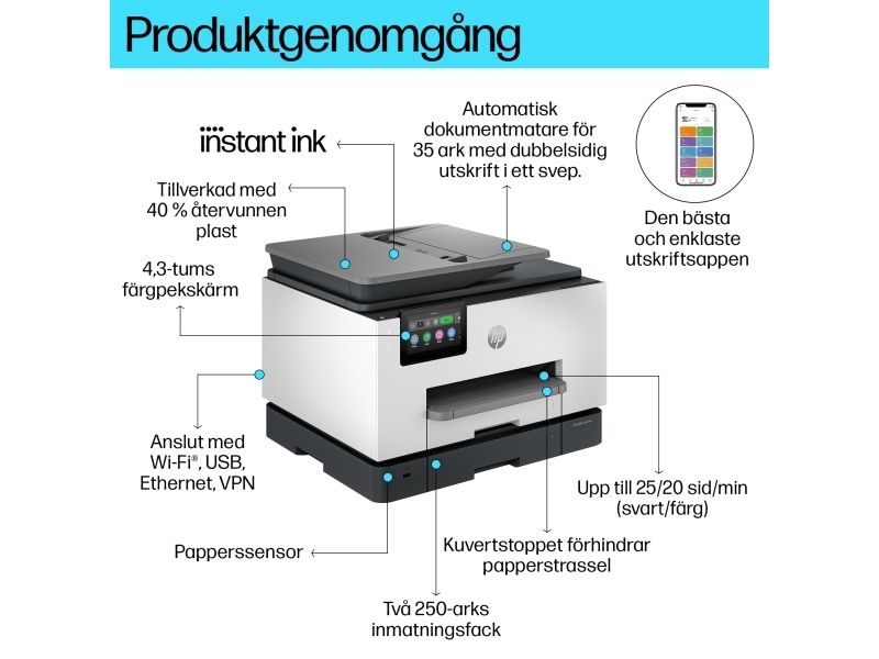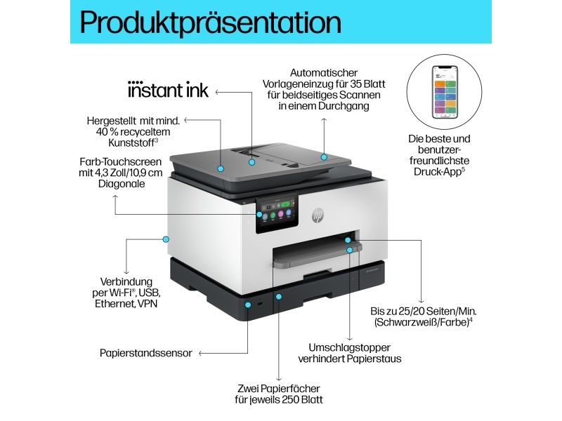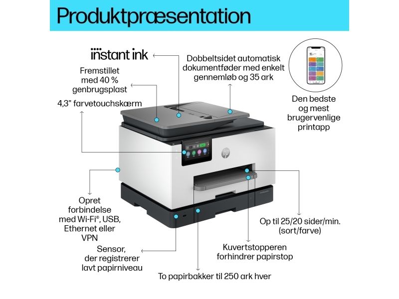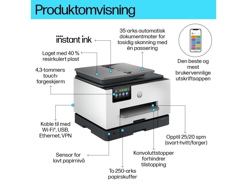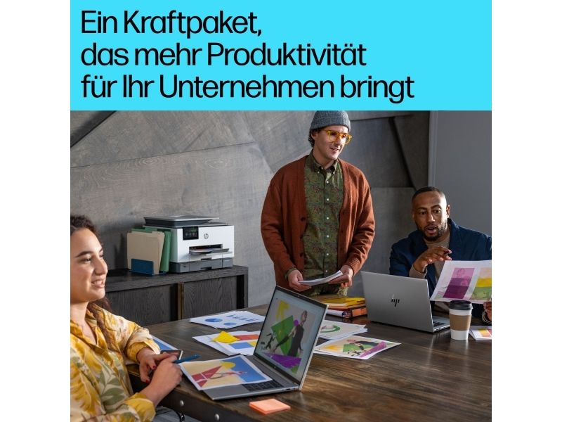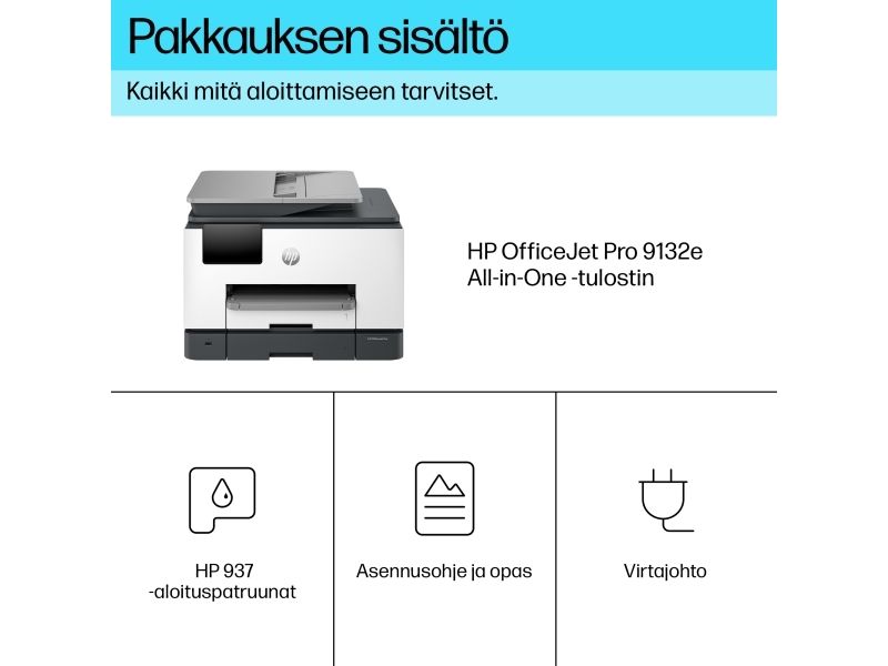 HP OfficeJet Pro 9132e monitoimitulostin, väri, tulostin pk-yrityksille, tulostus, kopiointi, skannaus, faksi, langaton; +; pikamusteyhteensopiva; 2-puolinen tulostus; 2-puolinen skannaus; automaattinen asiakirjansyöttölaite; faksi; kosketusnäyttö; Smart Advance -skannaus; pikapaperi, lämpömustesuihkutulostin, väritulostus, 4800 x 1 200 dpi, A4, suoratulostus, harmaa