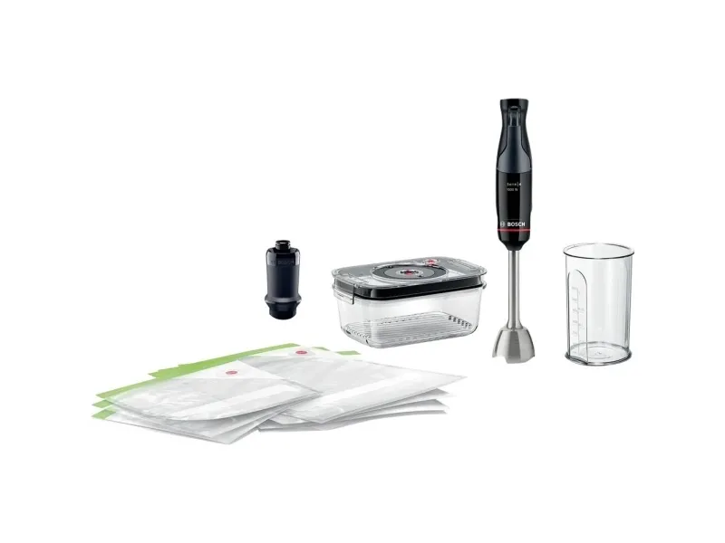 Discover the Bosch Serie | 4 ErgoMaster hand blender, a versatile and efficient kitchen tool designed to enhance your cooking experience. With its 4 QuattroBlade knives and stainless steel hand blender foot, it ensures smooth blending for a variety of ingredients. The included vacuum pump, vacuum container, and sealer bags help extend the freshness of your food, making meal prep more convenient. Its comfort grip and 1.4 m cord offer ease of use and flexibility, while the BPA-free plastic construction ensures safety and durability. Whether you're preparing smoothies, soups, or sauces, the Bosch Serie | 4 ErgoMaster is a reliable appliance for effortless blending.