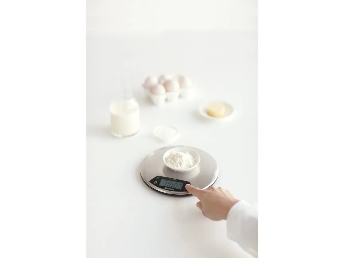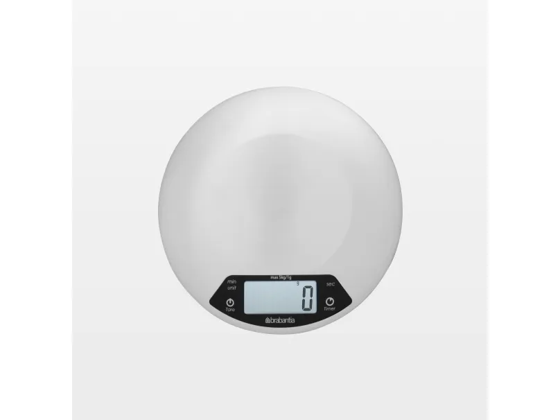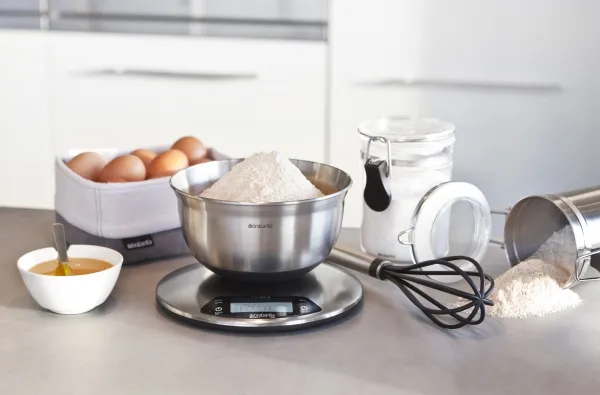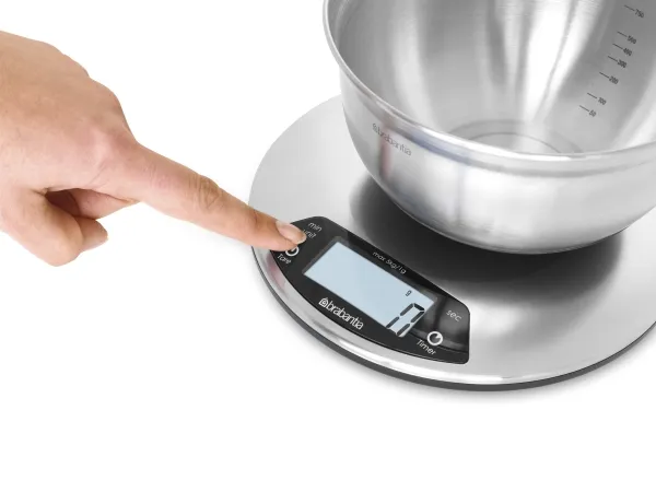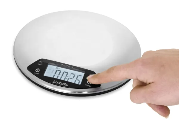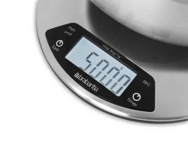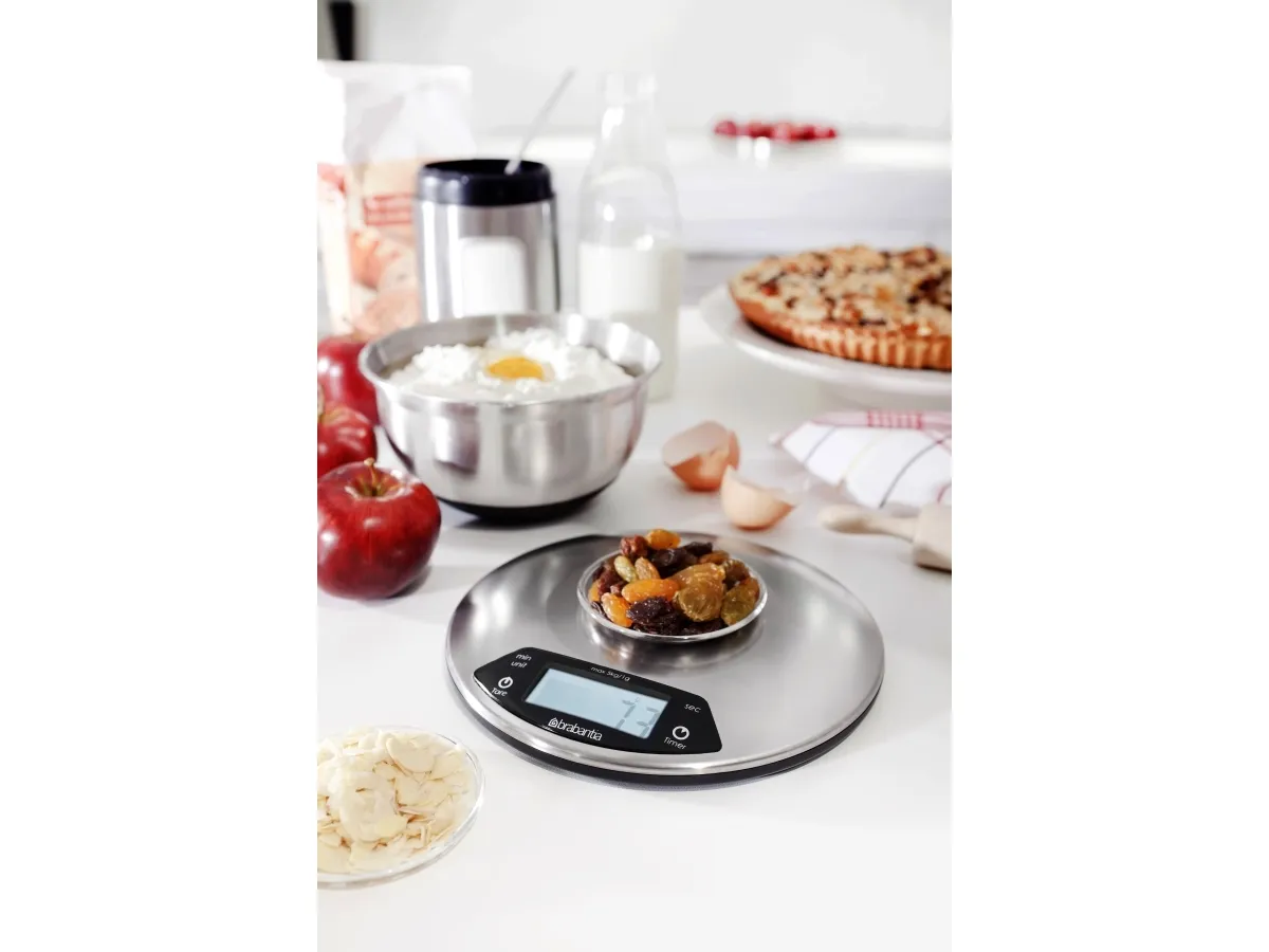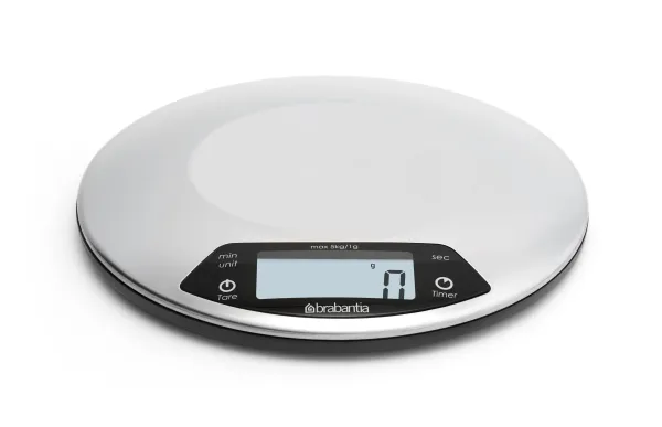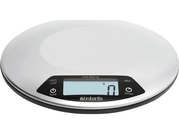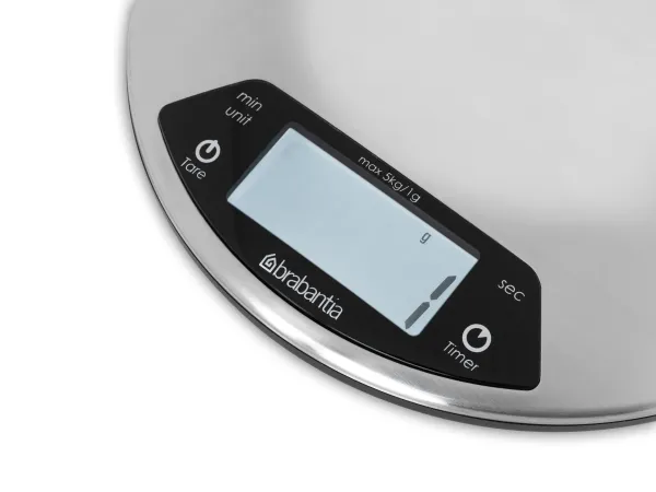 A sleek stainless steel piece of kit that boasts an integrated countdown timer with alarm to warn you when your cakes are ready.Brabantia 480560. Type: Electronic kitchen scale, Maximum weight capacity: 5 kg, Accuracy: 1 g. Battery type: AAA. Dimensions (WxDxH): 200 x 200 x 24 mm