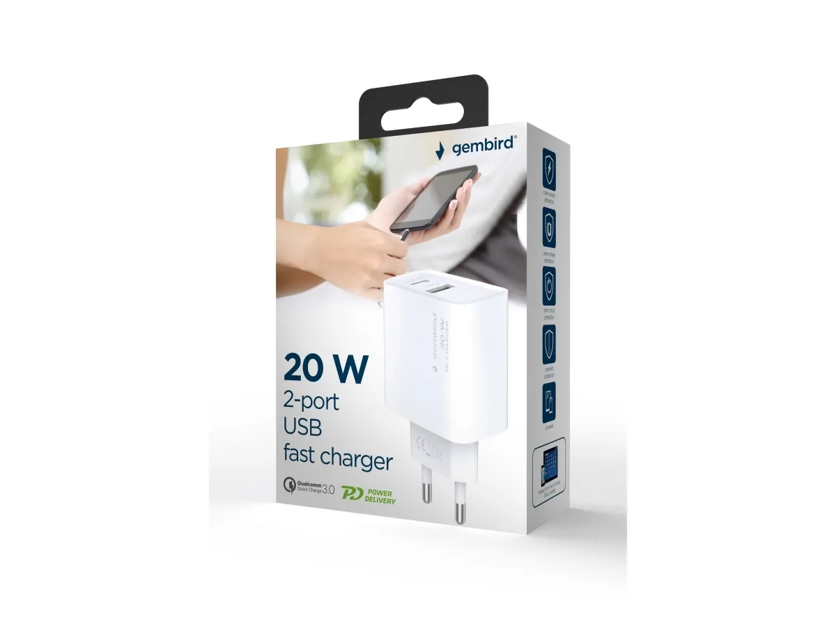 Discover the convenience and efficiency of the Gembird charger, a must-have accessory for your cellular phone. Designed to meet the needs of modern mobile users, this power adapter features both Power Delivery and Qualcomm Quick Charge 3.0 technologies, ensuring your device gets powered up quickly and safely. With advanced protection against overcharging, overheating, and short circuits, you can charge with confidence, knowing your device is safeguarded. Moreover, its dual output connectors, including a 24-pin USB-C and a 4-pin USB Type-A, make it incredibly versatile, supporting a wide range of devices. Whether at home or on the go, this charger is the perfect solution for keeping your devices charged and ready to use.