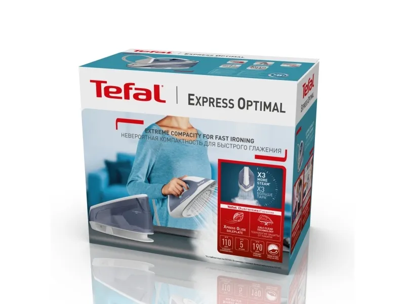 Tefal Express Optimal SV4110. Iron power: 2200 W, Steam boost performance: 190 g/min, Soleplate type: Ceramic Express Glide. Cord length: 1.6 m, Hose length: 1.6 m. Width: 160 mm, Depth: 308 mm, Height: 272 mm. Products per intermodal container (20ft): 1318 pc(s), Products per intermodal container (40ft): 2924 pc(s), Layers per pallet: 4 pc(s). Power: 2200 W, Country of origin: China