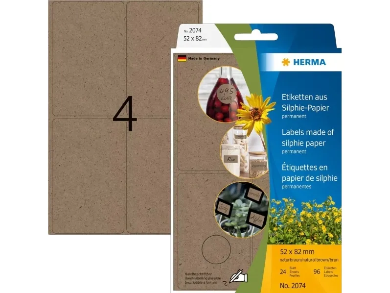 Special paper made from the queen of ecological crops: Danube silphie. An important habitat for bees, cultivated as an energy crop, ideal for binding CO2, valuable for the ecosystem. A contribution to sustainability. FSC™ Mix Credit certified. Grown in Germany, short transport routes, lower CO2 emissions. Modern kraft paper look, with at least 35% silphie fibre content. Suitable for direct contact with foodstuffs. Label paper recyclable as waste paper. End-to-end sustainability: labels and packaging. For hand inscription with any writing item and typewriter. Not suitable for PC printers, please use HERMA A4 labels.HERMA 2074. Product colour: Brown, Shape: Rounded rectangle, Adhesive type: Permanent. Width: 52 mm, Height: 82 mm. Labels per pack: 96 pc(s). Sustainability certificates: Forest Stewardship Council (FSC) Mix. Country of origin: Germany