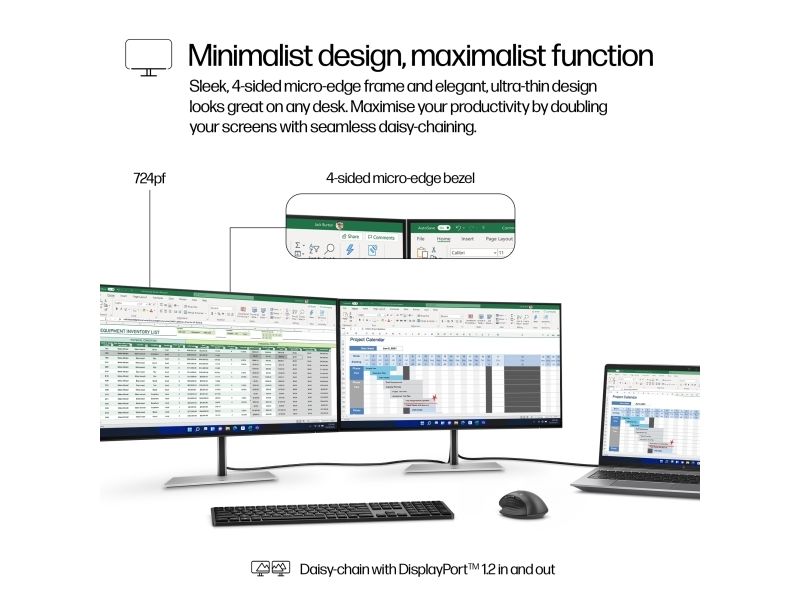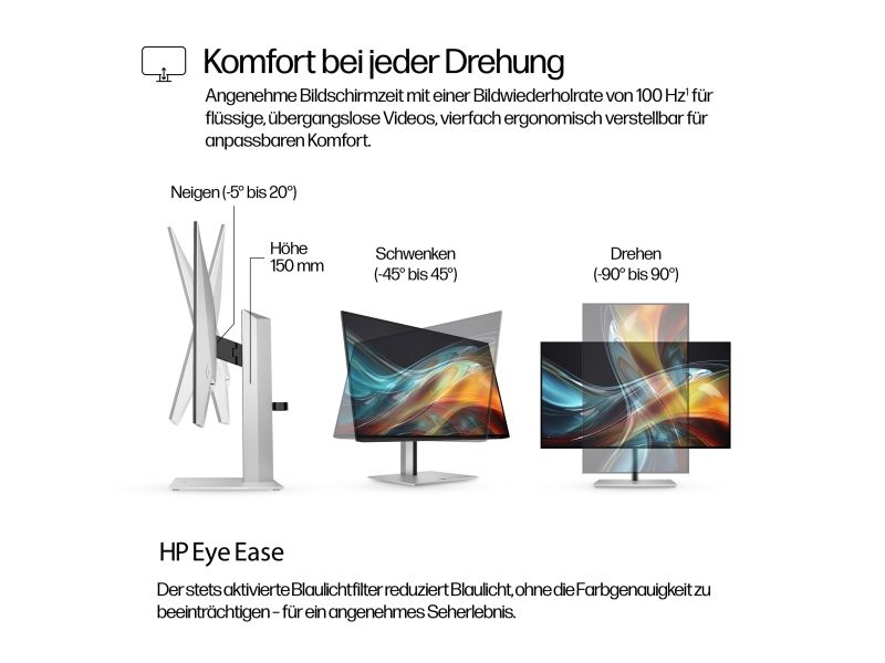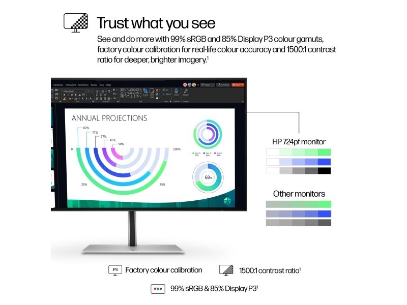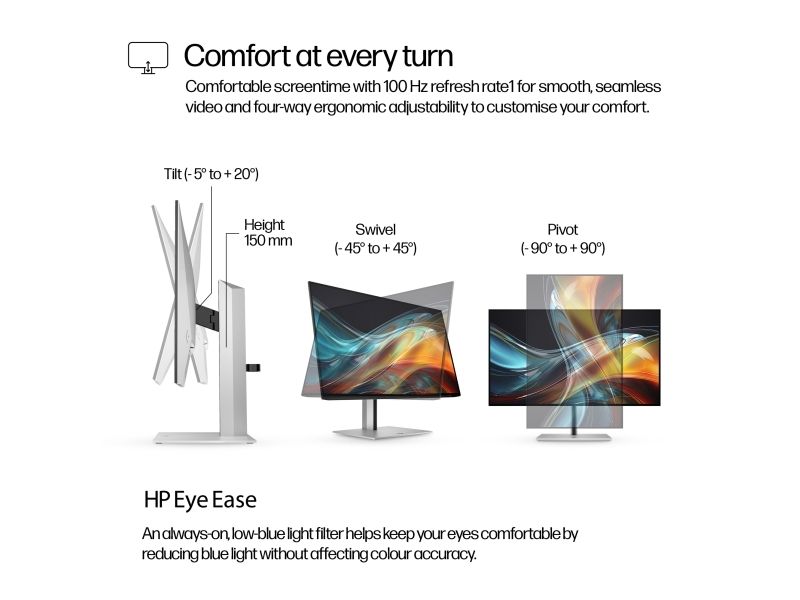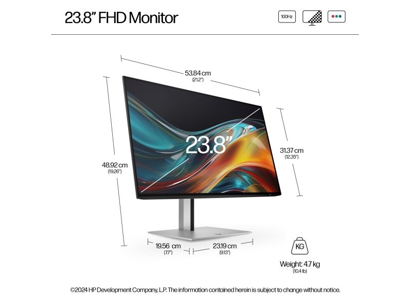Visually impactful Capture your vision better than you ever imagined with the HP Series 7 Pro 23.8" FHD Monitor. Trust what you see on screen with superb color accuracy right out of the box, a smooth 100 Hz refresh rate, and enhanced 1500:1 color contrast.[1] Do it all with the ultra-thin 4-sided micro-edge frame and built-in ergonomics.HP Series 7 Pro 23.8 inch FHD Monitor - 724pf. Display diagonal: 60.5 cm (23.8"), Display resolution: 1920 x 1080 pixels, HD type: Full HD, Display technology: LCD, Display surface: Matt, Response time: 5 ms, Native aspect ratio: 16:9, Viewing angle, horizontal: 178°, Viewing angle, vertical: 178°. Built-in USB hub, USB hub version: 3.2 Gen 1 (3.1 Gen 1). VESA mounting, Height adjustment. Product colour: Black, Silver