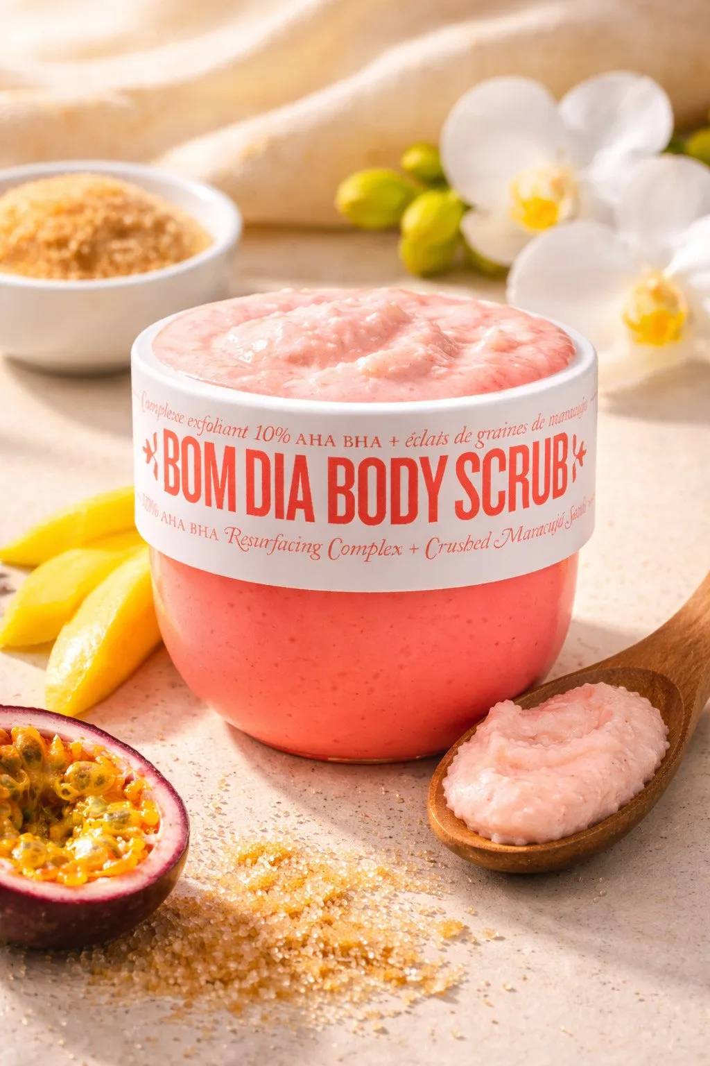 | Sol de Janeiro Bom Dia Bright™ Body Scrub kuorii ihoa hellävaraisesti ja jättää sen pehmeäksi, sileäksi ja hehkuvaksi – ja tuoksuu ylelliseltä. Tärkeimmät ainesosat * AHA-hapot – auttavat hienostamaan ihon rakennetta ja antavat lisää hehkua * Murskatut siemenet ja luonnolliset kuorinta-aineet – poistavat kuolleet ihosolut hellävaraisesti * Kosteuttavat ainesosat – jättävät ihon pehmeäksi ja joustavaksi Tulos: Iho tuntuu sileämmältä, pehmeämmältä ja kirkkaammalta, ja siinä on raikas, tasainen hehku. |