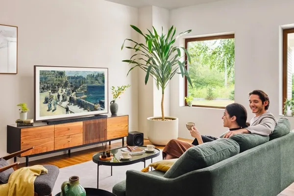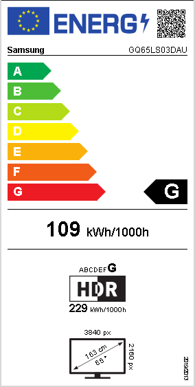 Samsung The Frame GQ65LS03DAU. Display diagonal: 165.1 cm (65"), Display resolution: 3840 x 2160 pixels, HD type: 4K Ultra HD, Display technology: QLED, Screen shape: Flat, LED backlighting type: Dual LED. Smart TV. Motion interpolation technology: Motion Xcelerator, Response time: 6 ms, Native aspect ratio: 16:9. Digital signal format system: DVB-T2 HD. Wi-Fi, Ethernet LAN. Product colour: Black