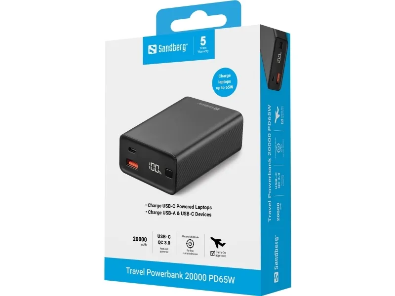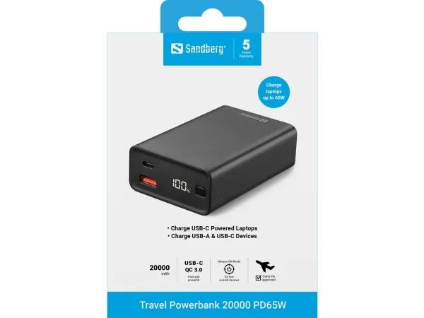 The Sandberg PD65W travel power bank provides a reliable solution for charging devices on the go. With a 20,000 mAh capacity, this power bank ensures that smartphones, tablets, and other electronics stay powered throughout travels. This power bank supports both USB-C and USB-A output, making it versatile for various devices, while the included 50 cm USB-C to USB-C cable adds convenience for direct connections. Designed for efficiency, the travel power bank utilizes Power Delivery and Quick Charge 3.0 technology to deliver up to 65 watts of power. Whether charging during a quick stop or a long journey, this power bank meets the needs of modern travelers. Compliant with multiple standards, such as FCC and RoHS, users can feel confident in their choice while enjoying consistent charging capabilities.