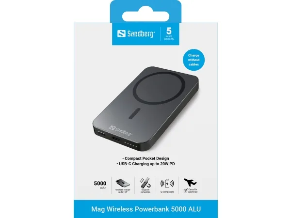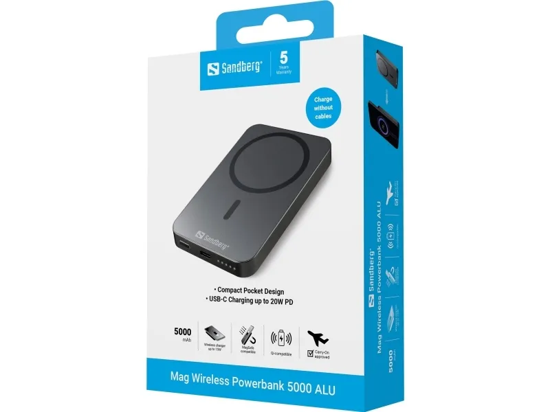 Sandberg Mag Wireless Powerbank 5000 ALU, 5000 mAh, Litium, Virransyöttö, Langaton lataus, Musta
