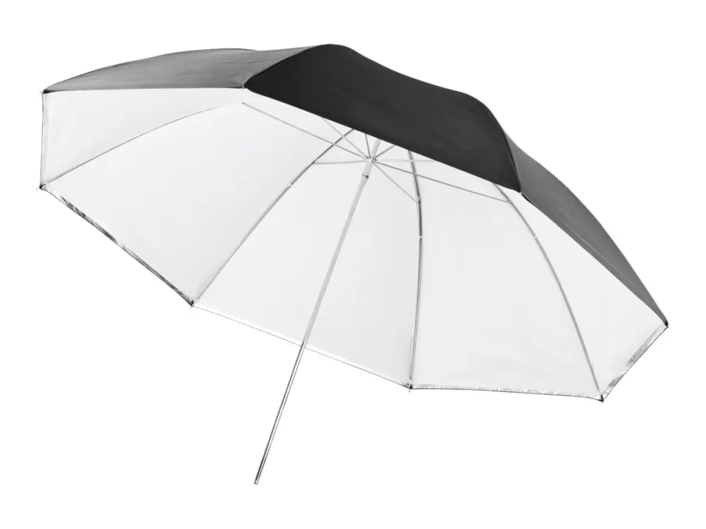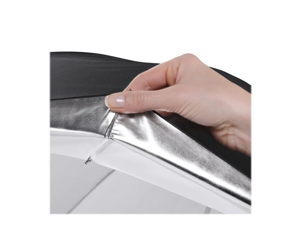This umbrella by Walimex is particularly convenient, as it is reflex umbrella and translucent umbrella at the same time. It consists of two layers, the outer reflex layer, which is coated silver on the inside and black on the outside, and the inner white translucent layer. In order to turn the umbrella from a reflex umbrella into a translucent umbrella, you can simply remove the outer layer.