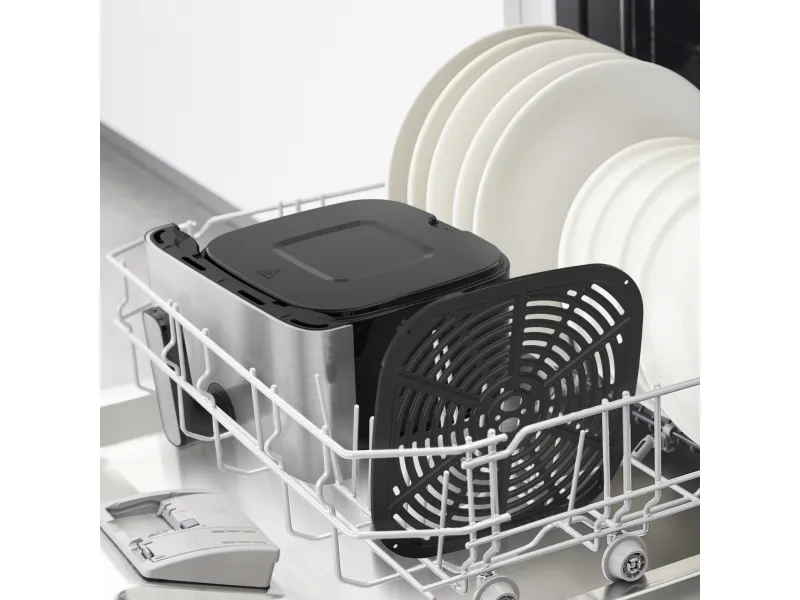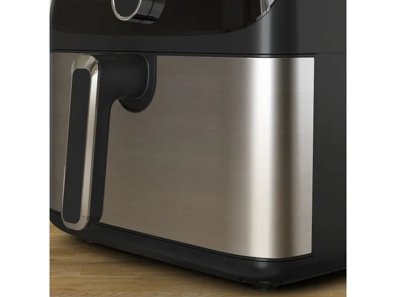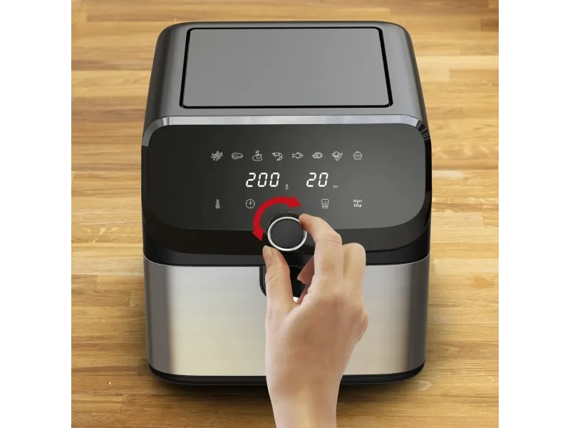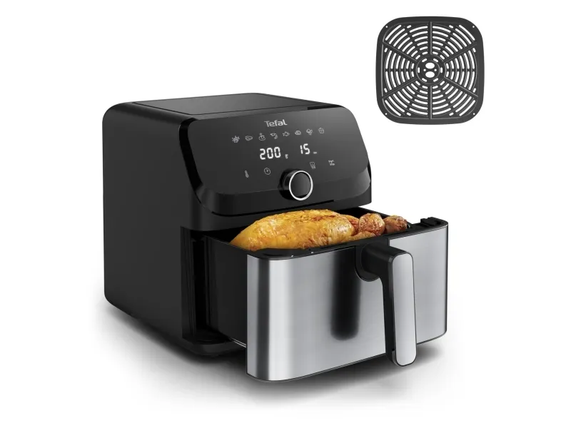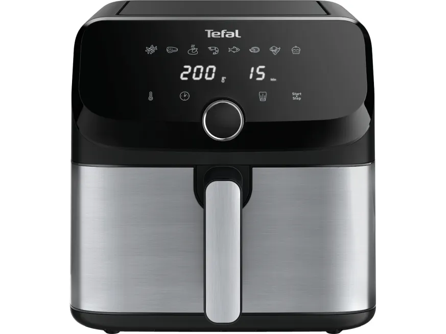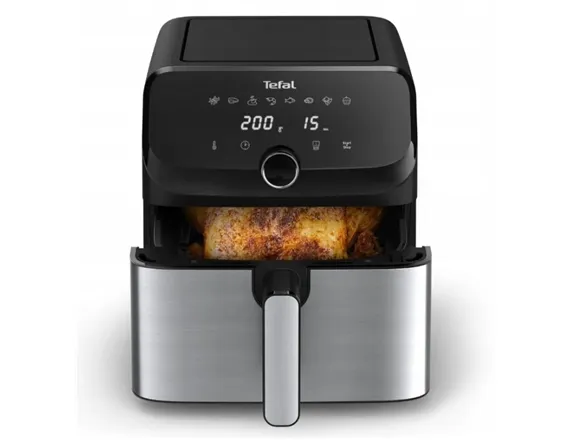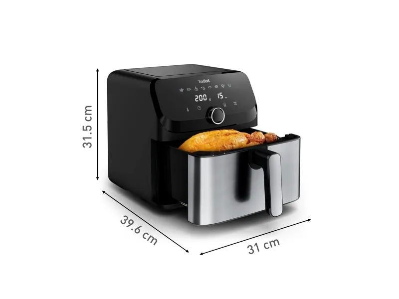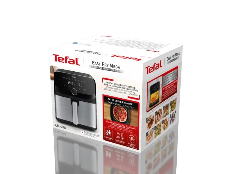 Tefal Easy Fry Mega EY855D10. Product type: Hot air fryer, Capacity: 7.5 L, Temperature (min): 80 °C. Construction type: Single, Product colour: Black, Stainless steel, Control type: Rotary, Touch. Display type: LCD. Power: 2020 W. Width: 310 mm, Depth: 396 mm, Height: 315 mm