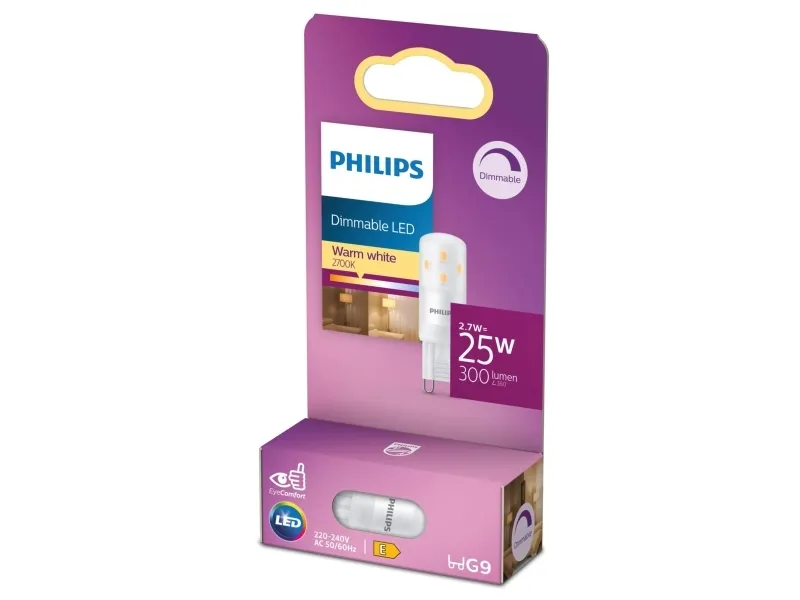 Philipsin LED-lampussa yhdistyvät energiatehokkuus ja pitkäikäinen suorituskyky, ja se sopii täydellisesti sisäkäyttöön. Vain 2,7 W:n virrankulutuksen ansiosta se korvaa perinteiset 25 W:n lamput ja auttaa vähentämään energiakustannuksia. Tämä kapselinmuotoinen lamppu säteilee lämpimän valkoista valoa 2700 K:n värilämpötilassa, mikä luo viihtyisän tunnelman mihin tahansa tilaan. Lampun valoteho on 300 lumenia ja sädekulma 320 astetta, joten se takaa laajan ja tehokkaan valaistuksen. Se on suunniteltu EyeComfort-teknologialla, joka mahdollistaa miellyttävät valaistusolosuhteet. Lisäksi sen himmennettävä ominaisuus mahdollistaa säätämisen erityisten himmentimien avulla, mikä vastaa erilaisia valaistustarpeita. Tämän lampun käyttöikä on 15 000 tuntia ja se kestää jopa 50 000 kytkentäsykliä, joten se on luotettava valinta sisäympäristöjen parantamiseen.