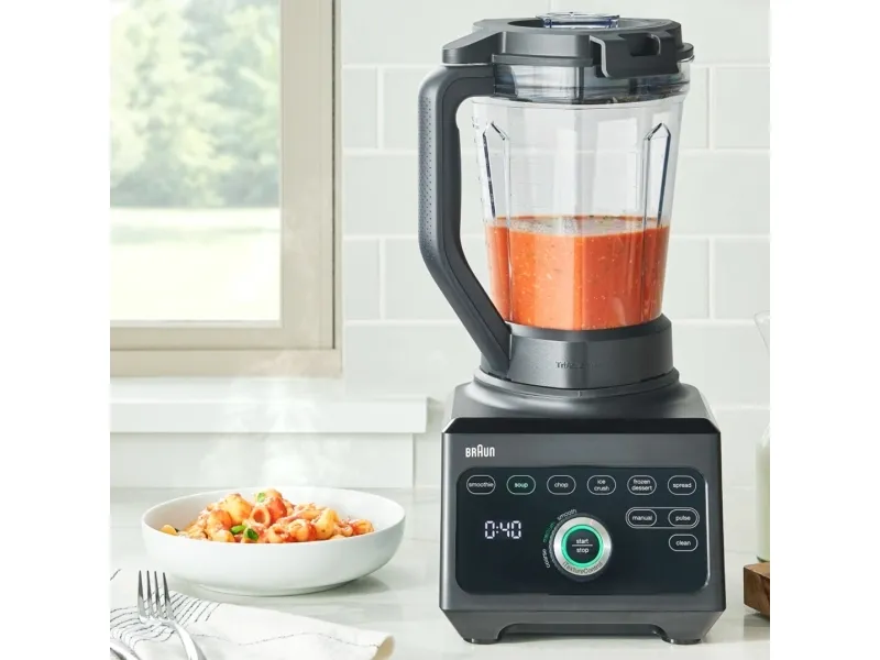Discover the Braun PowerBlend 9, designed for those who value functionality and style in their kitchen appliances. This blender is equipped with a robust 1.6 kW motor that can reach speeds of up to 45,000 rpm, ensuring your ingredients are perfectly blended. Whether you're crushing ice for smoothies, preparing hot soups, or making frozen desserts, the PowerBlend 9 has you covered with its 10 speed settings and additional pulse function. The tritan pitcher is durable and BPA-free, ensuring your creations are safe for the whole family. With dishwasher-safe removable parts, cleanup is easy. The Braun PowerBlend 9 is an essential tool for any modern kitchen.
