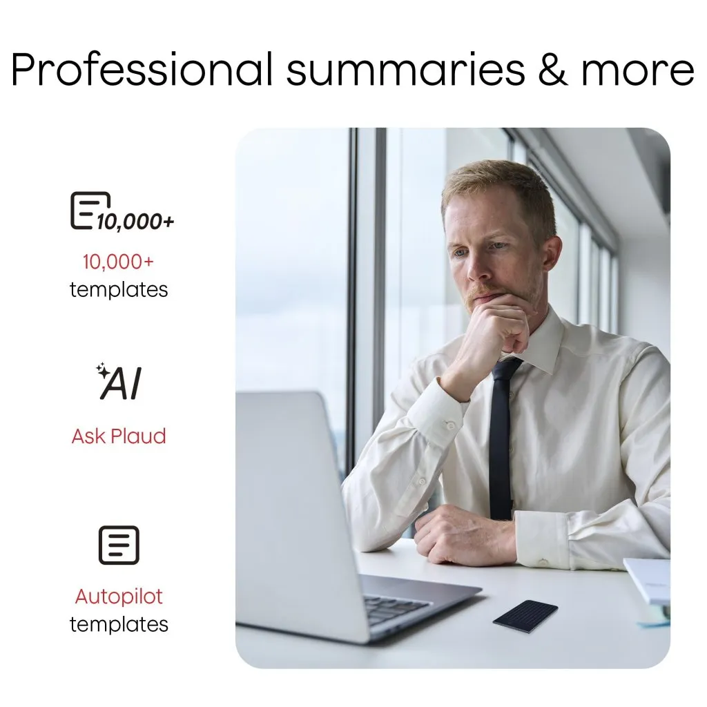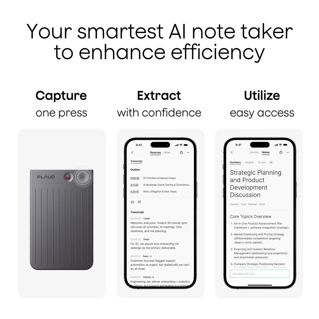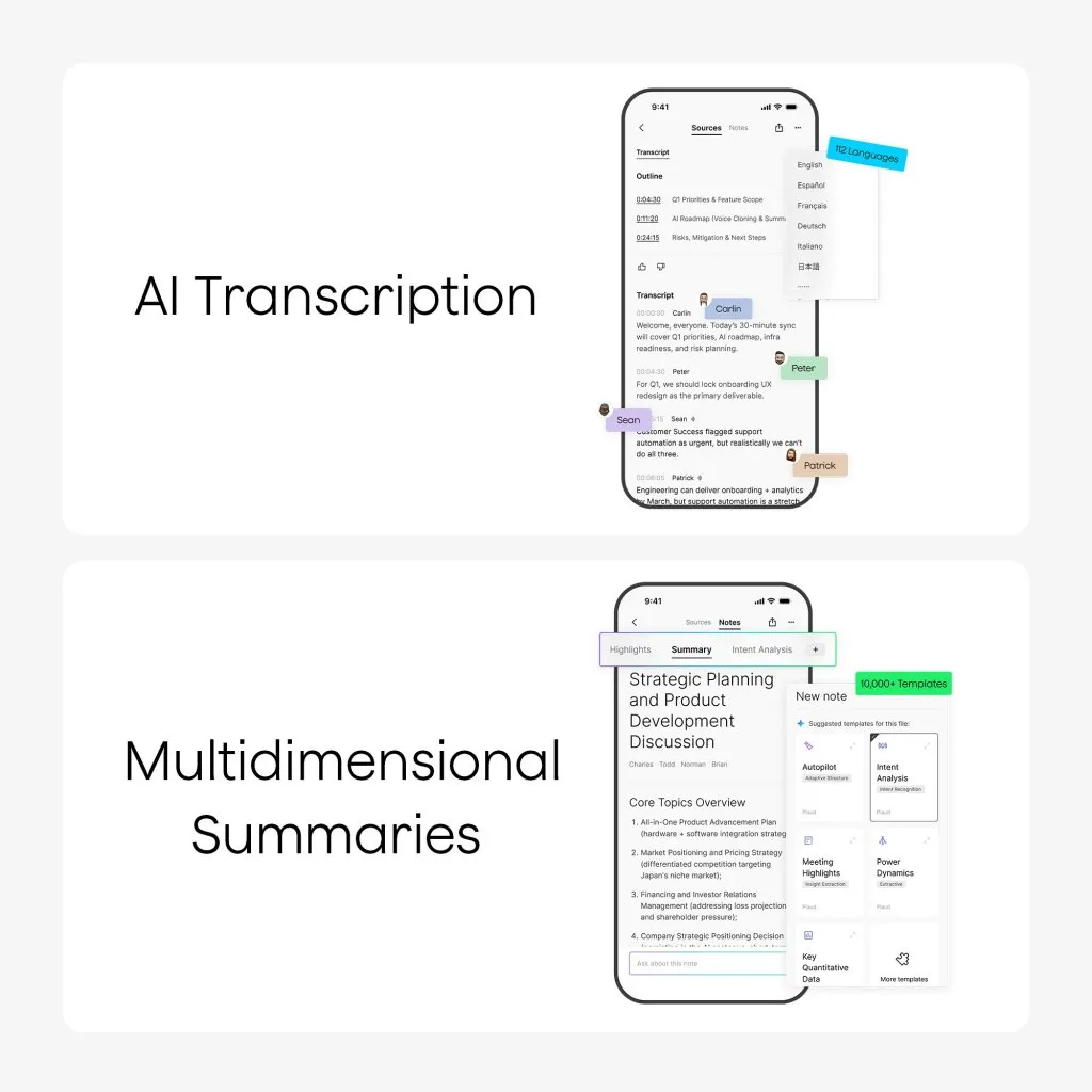 Plaud Note muuntaa tallenteet käyttökelpoiseksi tiedoksi automaattisella kielentunnistuksella, puhujamerkinnöillä ja mukautetun sanaston tuella tarkkuuden parantamiseksi. AI-luodut yhteenvedot ja rakenteelliset muistiinpanot korostavat keskeisiä kohtia ja toimenpiteitä yli 10 000 AI-pohjaisen mallin avulla eri toimialoille. Merkitse tärkeitä hetkiä, lisää kirjoitettuja muistiinpanoja tai kuvia ja käytä Ask PLAUD -toimintoa hakeaksesi suoraan litteroinneista ja yhteenvedoista ilman tallenteiden uudelleentoistoa.
