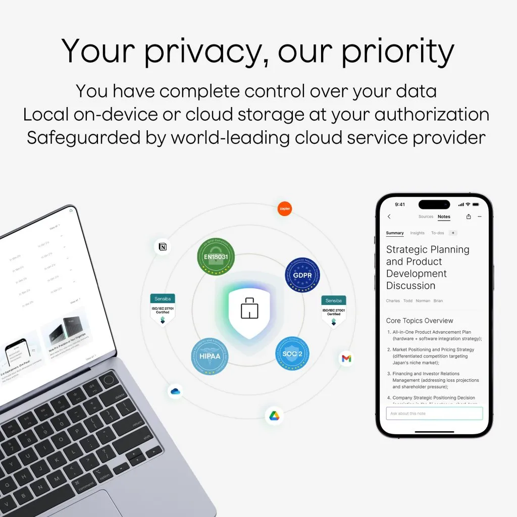 Plaud on täysin GDPR compliant, mikä korostaa Plaudin sitoutumista korkeimpiin tietosuojastandardeihin. Yhdessä SOC 2 Type II ja HIPAA -standardien kanssa tallenteesi ja AI-generoidut muistiinpanosi suojataan aina yritystason salauksella—joten ammattilaiset ympäri Eurooppaa ja maailmaa voivat käyttää PLAUDia luottavaisin mielin.