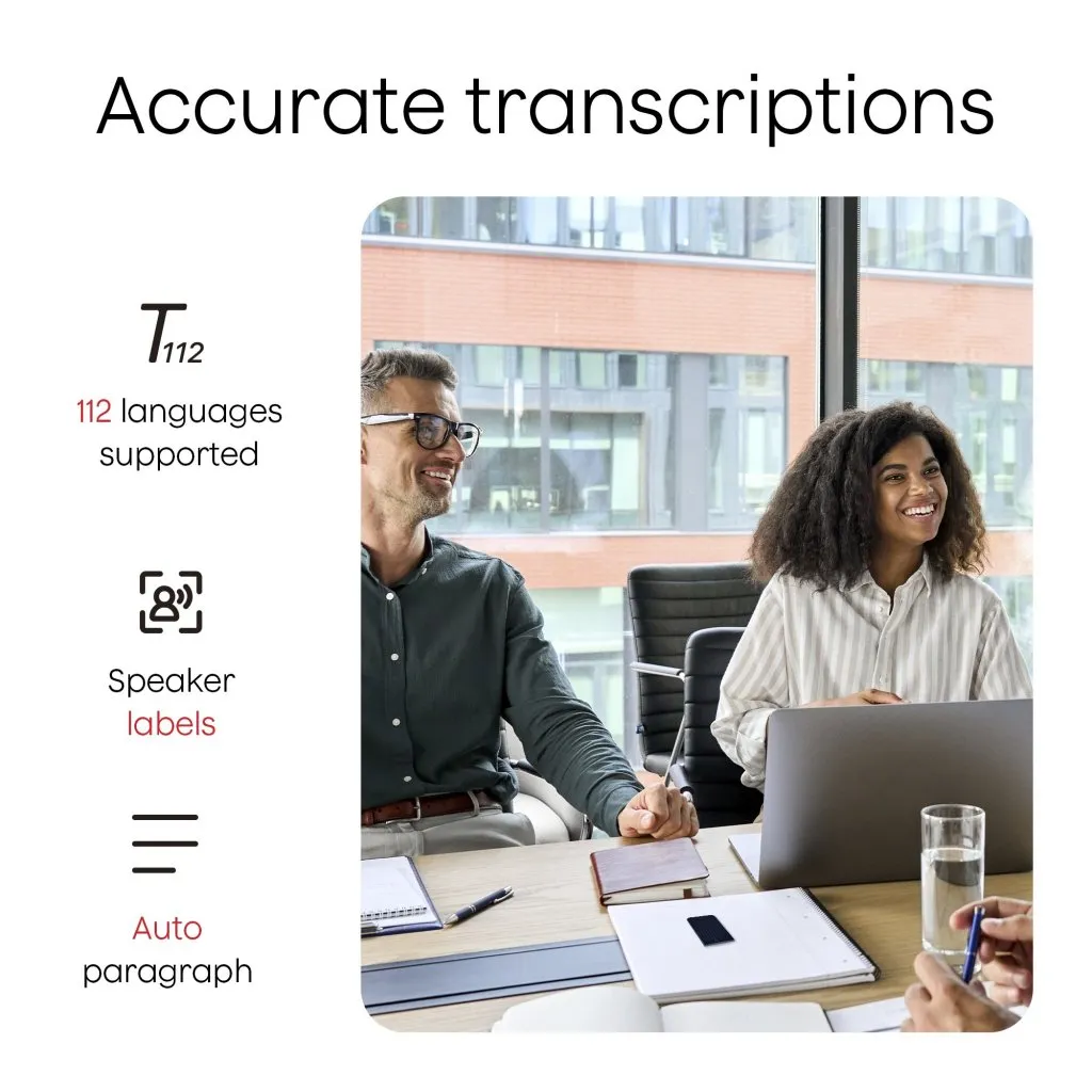 Muunna keskustelut selkeäksi, käyttökelpoiseksi tekstiksi 112 kielellä, vahvalla tuella eurooppalaisille kielille ja aksenteille. Plaud Note tarjoaa jopa 95 % litterointitarkkuuden todellisissa kokouksissa, keskusteluissa ja haastatteluissa uusimman AI-pohjaisen puheentunnistuksen avulla.