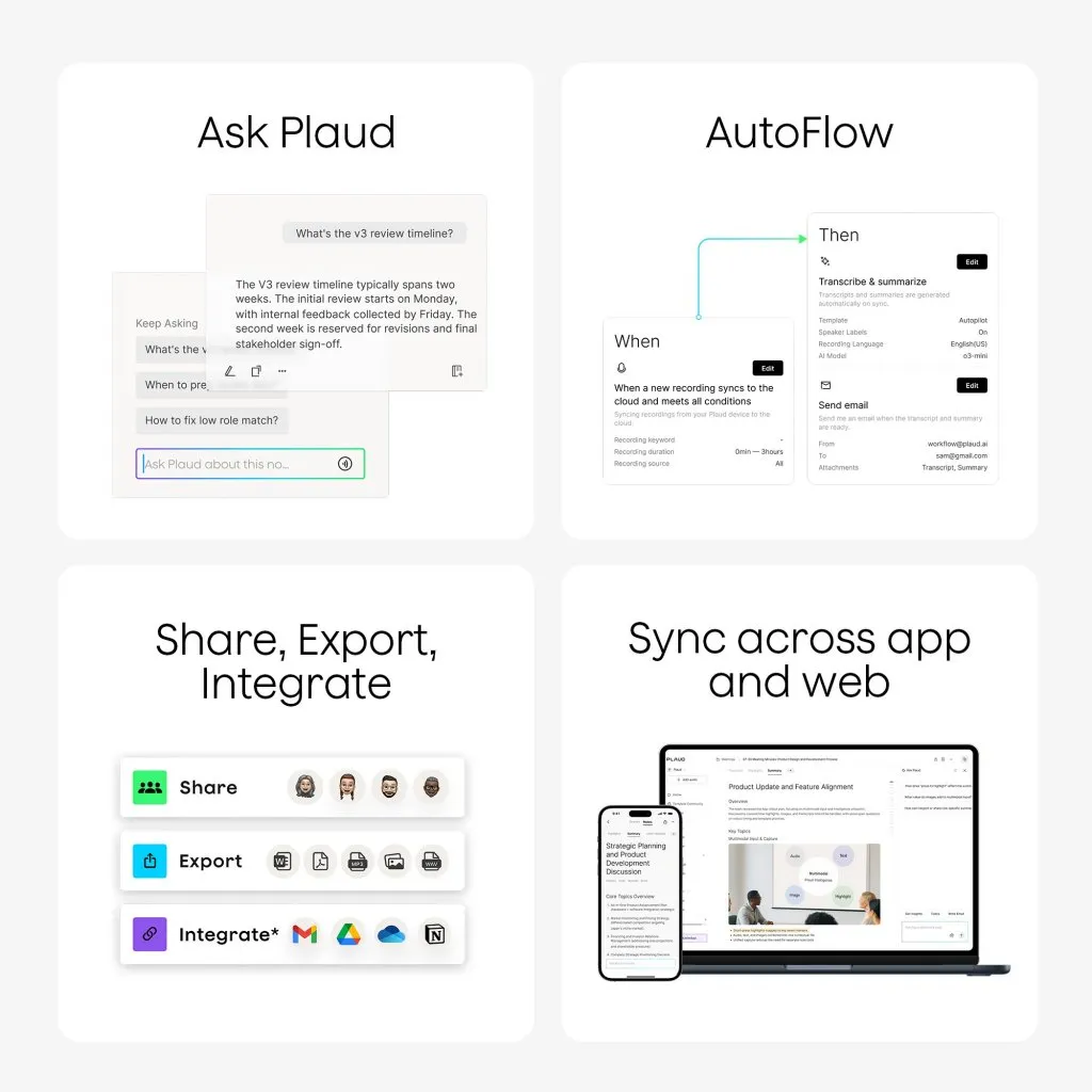 Plaud Note integroituu saumattomasti Plaud-sovelluksiin mobiilissa, webissä ja Desktopissa ja kokoaa tallenteet, litteroinnit, yhteenvedot ja AI-oivallukset yhteen työtilaan. Sovelluksilla voit tarkastella, hakea, merkitä ja esittää kysymyksiä Ask PLAUD -toiminnolla, kun taas PLAUD Desktop voi tallentaa verkkokokouksia suoraan Google Meet-, Zoom- ja Teams-alustoilta — jolloin kaikki keskustelut pysyvät järjestyksessä yhdessä paikassa