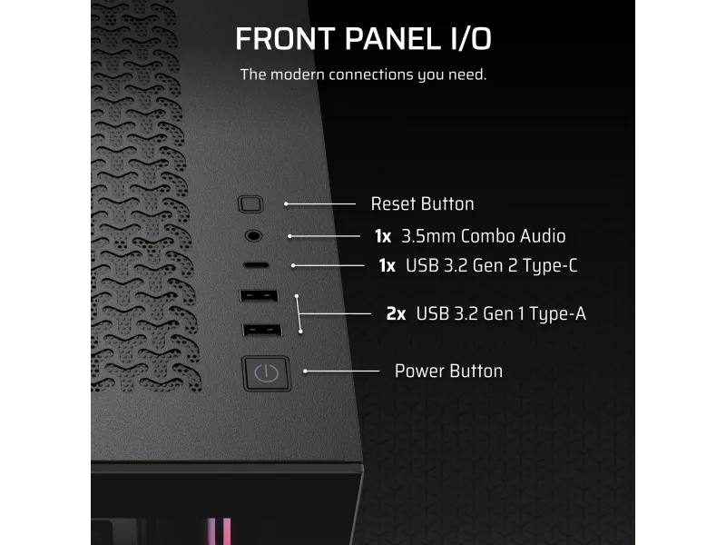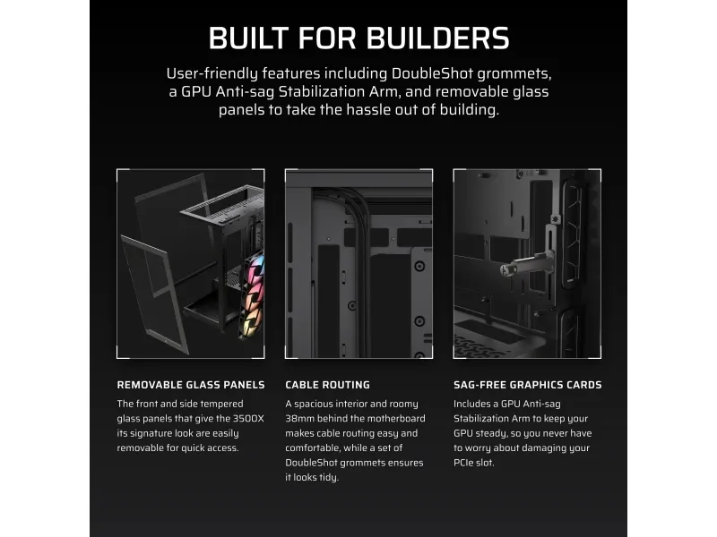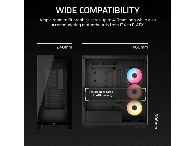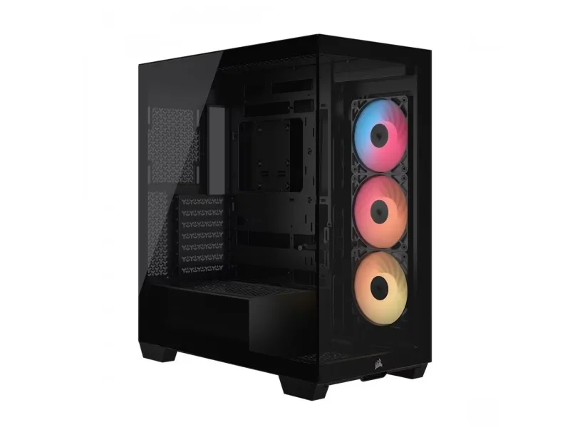 The CORSAIR 3500X RS-R ARGB chassis combines functionality with aesthetic appeal, designed to enhance your PC build. Its mid-tower form factor allows for ample space, accommodating a variety of components while maintaining an organized layout through its cable management system. Panoramic tempered-glass panels showcase the internal components beautifully and offer easy access for upgrades and maintenance. The chassis features multiple dust filters to protect against debris and supports ARGB fans for customizable lighting that adds a unique touch to any setup. Cooling options are ample, with flexibility for various fan and radiator configurations, ensuring optimal airflow and temperature management for high-performance builds. The robust structure of this case, made from steel and tempered-glass, provides durability while the sleek design appeals to gamers and PC enthusiasts alike. With generous space for expansion and compatibility with various motherboard types, the CORSAIR 3500X RS-R ARGB is a smart choice for builders seeking style and efficiency.