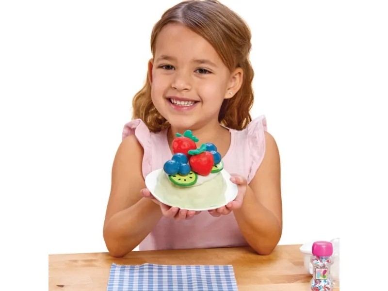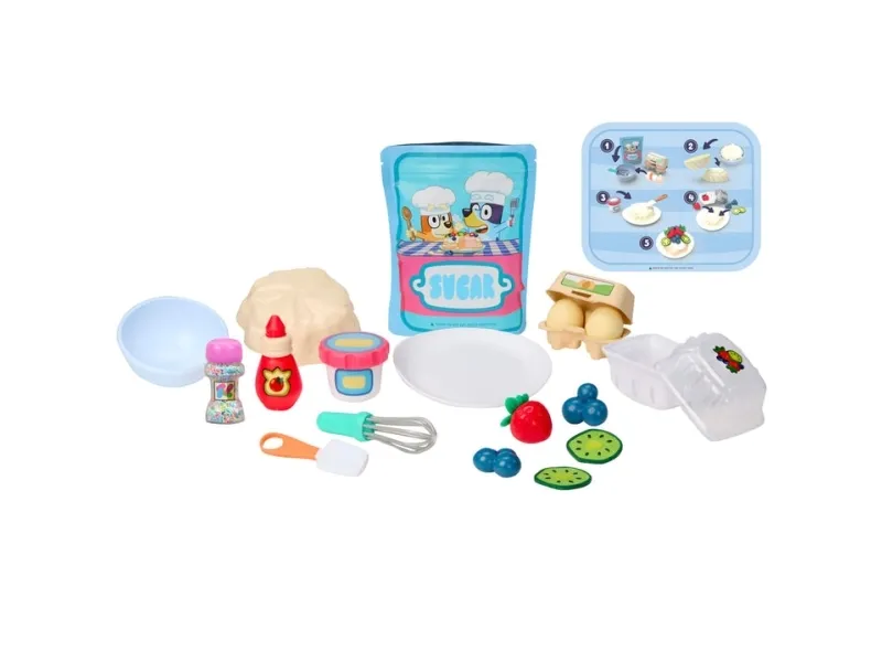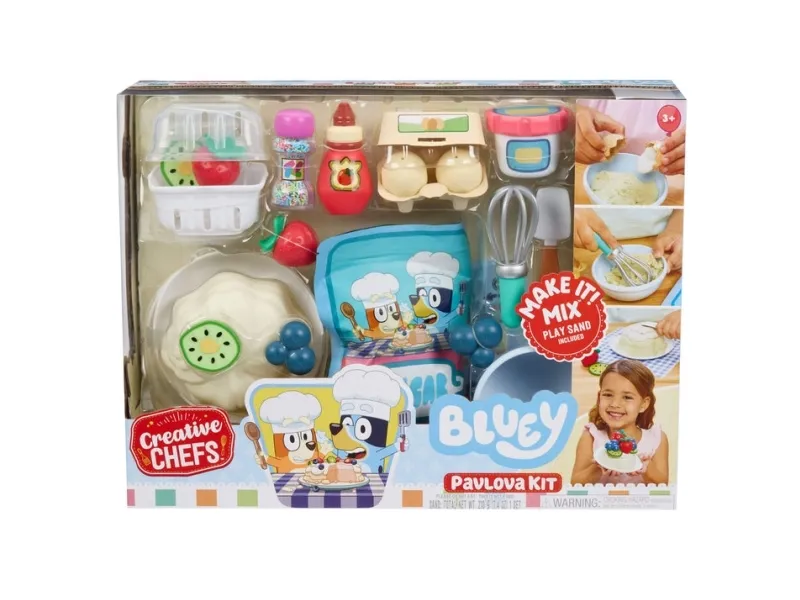 Creative Chefs Bluey Pavlova Kit empowers kids to get creative through hands-on learning and imagination. With highly detailed, functional pieces kids build their dish and create their own replicas of their favorite character's special treat. 20 realistic cooking accessories including serving plate, pavlova mold pan, whisk, spatula, egg carton, 2 eggs with play sand, sprinkles container, fruit container, 2 strawberries, 2 blueberries, 2 kiwi slices, tomato paste bottle, cream container with play sand, sugar bag with play sand, mixing bowl and recipe card. From 3 years.