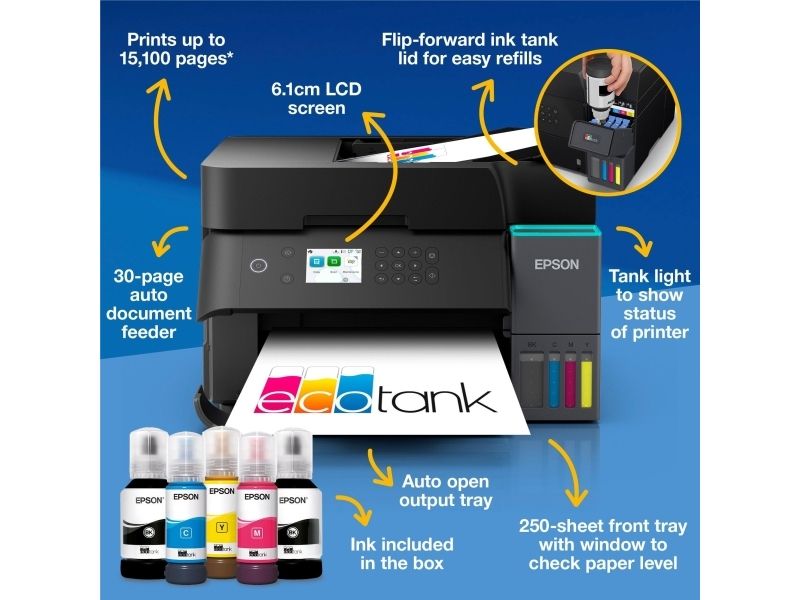 The Epson EcoTank L6370 is an all-in-one printer that combines printing, scanning, and copying capabilities for productivity. With a duty cycle of 15,100 pages, this printer is designed to handle large volumes of work efficiently. Users can enjoy mobile printing options through Apple AirPrint, Mopria Print Service, and more, making it easy to print from various devices. The connectivity options, including USB, LAN, and Wi-Fi, ensure versatile use in any office setup. This printer supports a range of media types and sizes, making it suitable for different printing needs while delivering color prints at a resolution of 4800 x 1200 DPI.