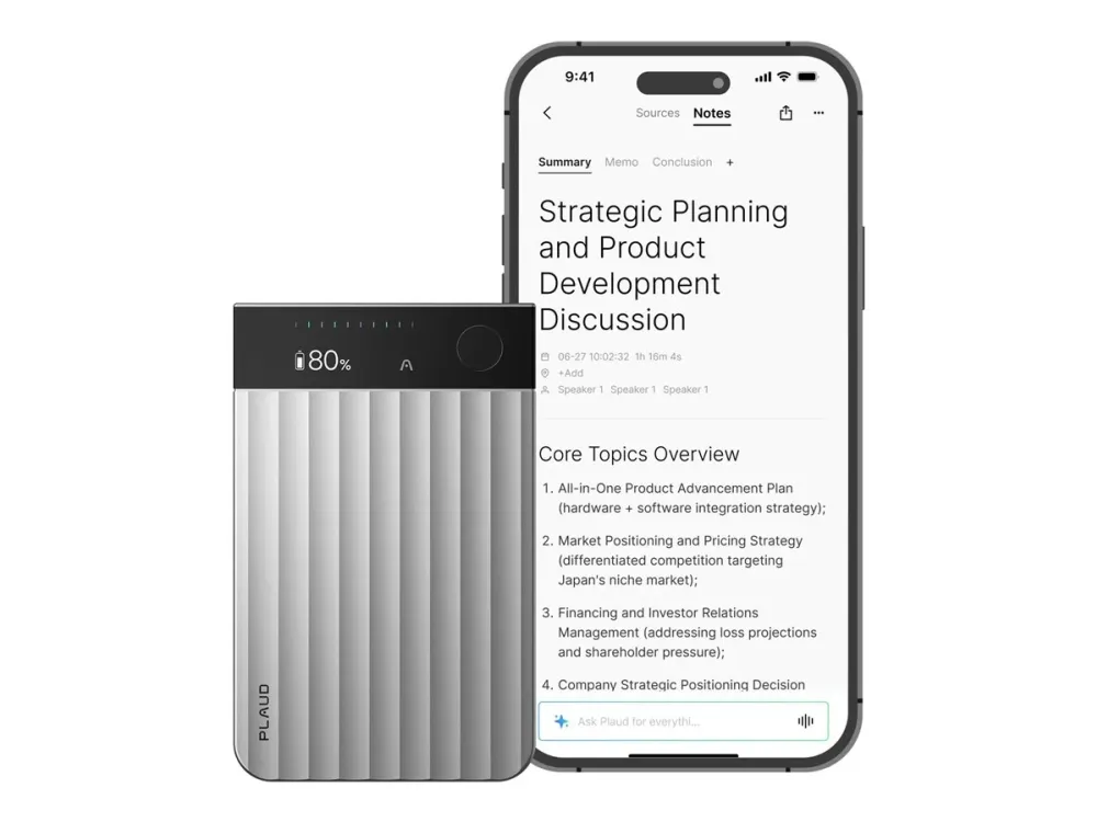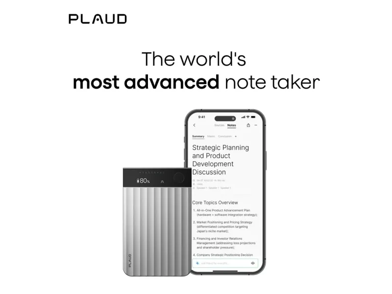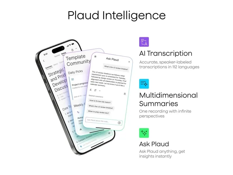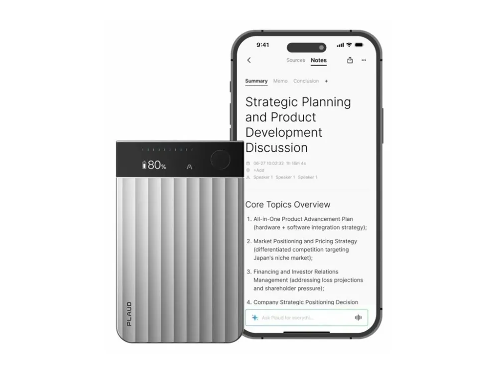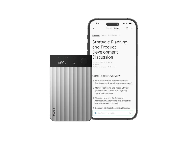 Works with the PLAUD app on iOS and Android; access via app, web, and desktop.