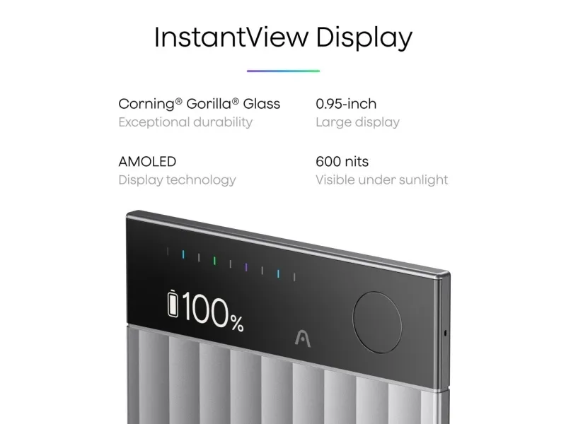 A premium aluminum-alloy body topped with Corning Gorilla Glass keeps the 0.95" InstantView AMOLED display protected and legible (600 nits). Credit-card thin, 2.99 mm, 30 g, and it snaps magnetically to your phone.