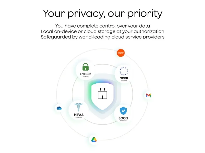 Your data stays yours. PLAUD is ISO 27001, ISO 27701???????, GDPR, SOC 2, HIPAA, and EN18031 compliant, with secure sync across app, web, and desktop, and unlimited cloud storage.