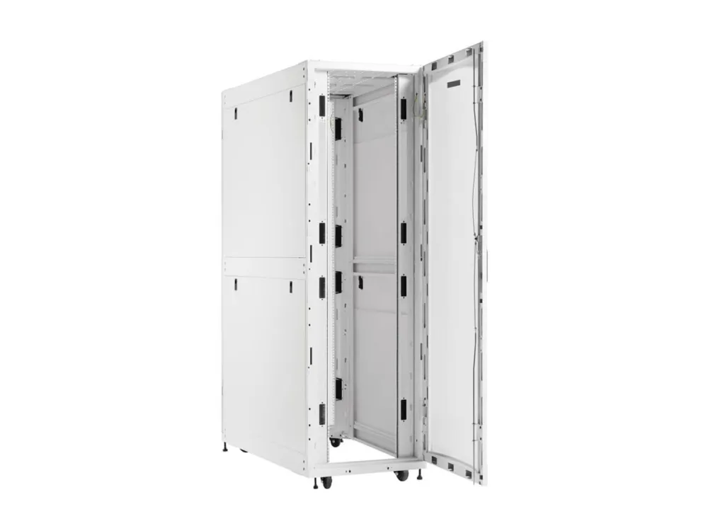 The Eaton SmartRack SRH482454W rack enclosure cabinet provides a robust solution for organizing and securing equipment. Constructed from heavy-duty steel, this extra-deep cabinet is designed to withstand substantial weight, supporting up to 2268 kg. It features a lockable design to enhance security, making it ideal for any environment where protection and accessibility are essential. The inclusion of casters and leveling legs offers versatility in placement, ensuring stability on various surfaces. This enclosure comes equipped with 4 vertical mounting rails and is compliant with EIA-310-E and RoHS standards. The cabinet is delivered with essential accessories, including 2 keys, 4 side panels, 60 cage nuts, 8 side panel locks, and 60 nylon cup washers, allowing for easy assembly and customization. With its powder coat finish, the rack provides durability and ensures a professional appearance in any setting.