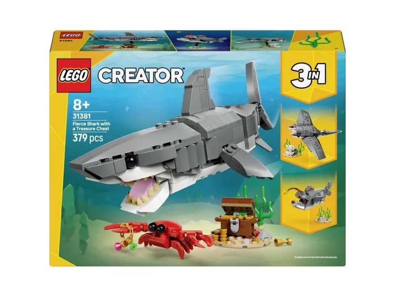 3 IN 1 ‑MERIELÄINLELU – LEGO® Creator 3 in 1 Hurja hai ja aarrearkku (31381) lelusetin palikoista yli 8-vuotiaat pojat ja tytöt voivat rakentaa 3 erilaista merieläinhahmoa yhä uudelleen