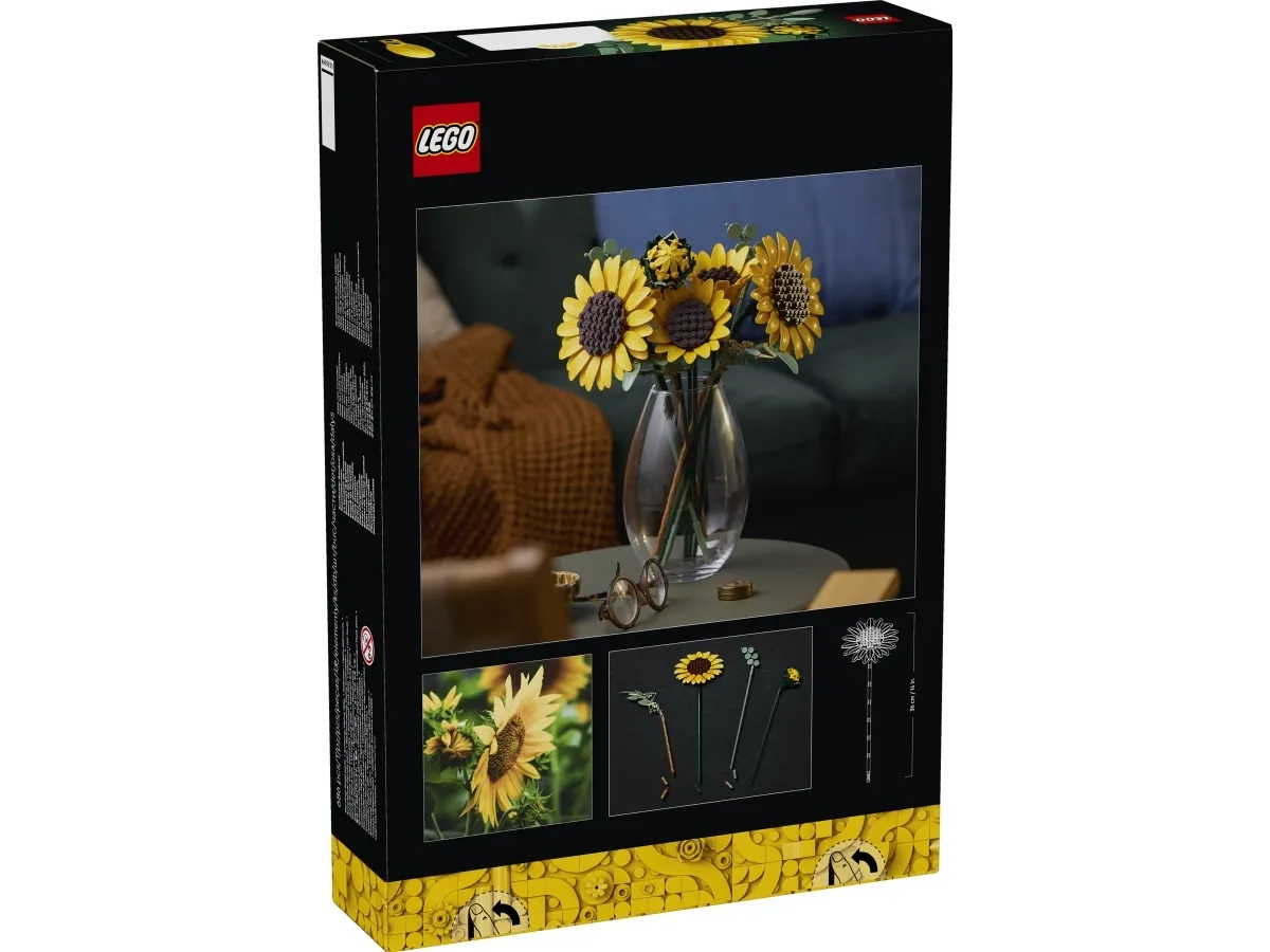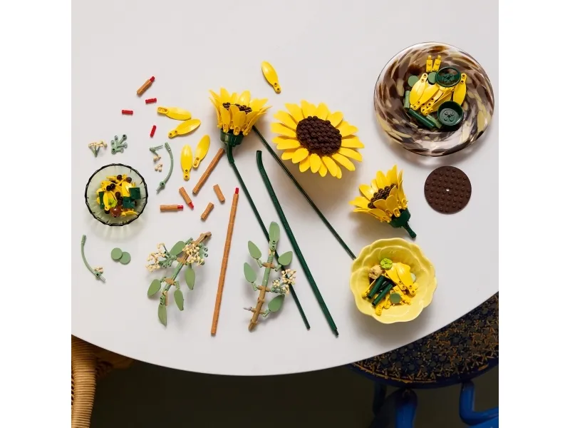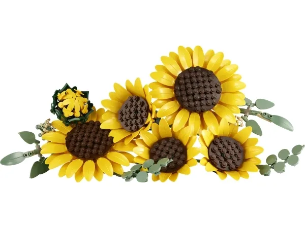 LEGO® AURINGONKUKAT – Kimpussa on 6 auringonkukkaa kukinnan eri vaiheissa: 1 auringonkukan nuppu, 3 puhkeamaisillaan olevaa auringonkukkaa ja 2 isoa, täysin avautunutta auringonkukkaa