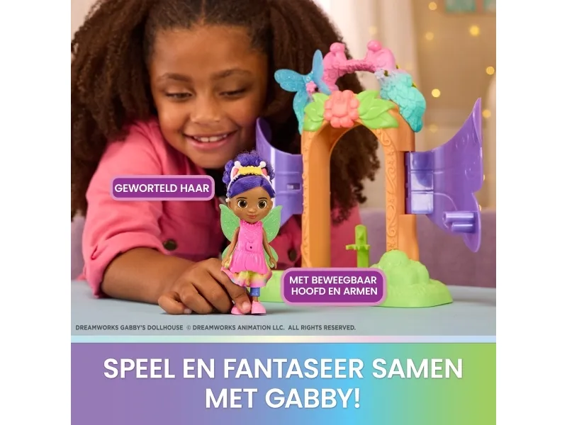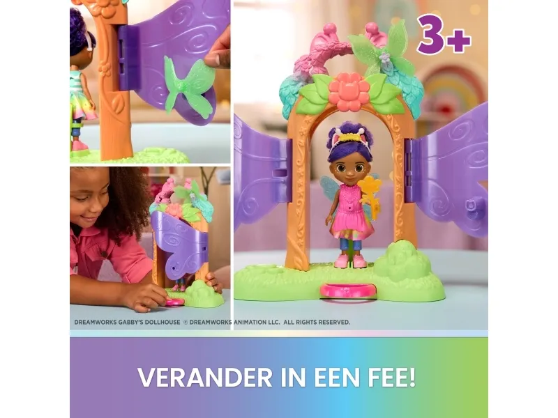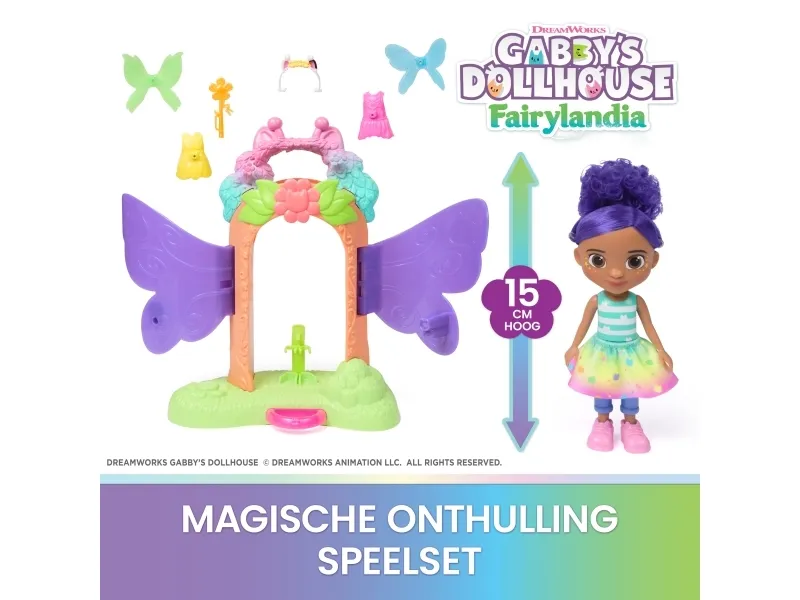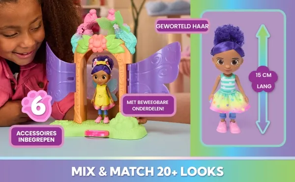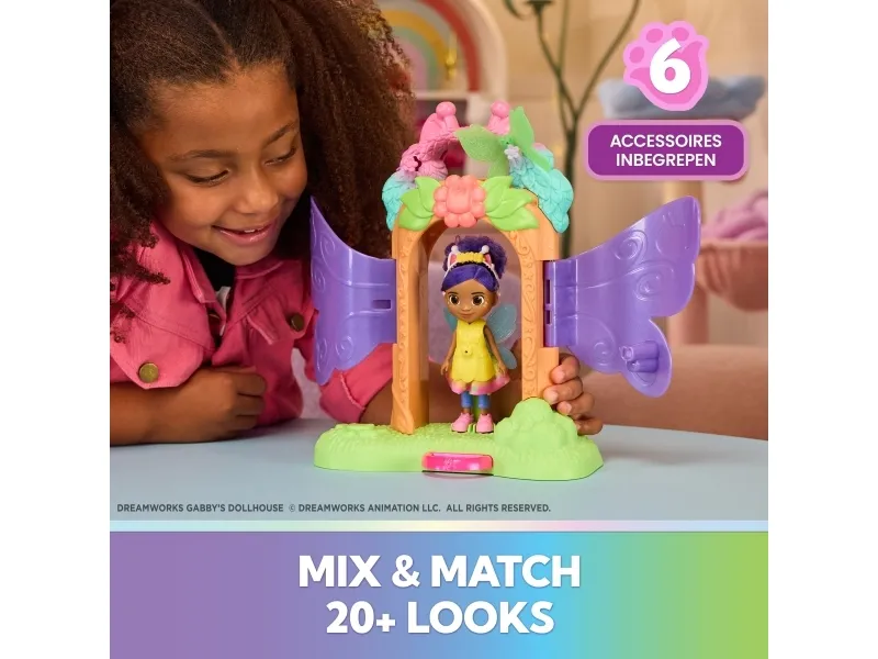 Enter the whimsical world of Gabby’s Dollhouse Fairylandia with the enchanting Fairy Magic Reveal Playset! Kids can attach one of the pairs of fairy-doll wings via the butterfly-shaped magnets and one of the fairy tops via the cat-shaped magnets for easy setup of the playset. Then place Gabby at the centre and pull the pink lever to watch her transform into a magical fairy. With over 20 mix-and-match outfits to create— with 8 accessories including removable hairband, shoes, a wand and fairy tops—this set inspires creativity, customisation, and endless imaginative adventures. The Gabby doll stands 15 cm tall with rooted hair, movable head and limbs to create the next Fairylandia adventure at home. For those who love doll's house accessories, this playset is a cat-tastic pick for birthdays, the Festive season, or any magical occasion. Kids can create their own mysteries as they join Gabby and her dollhouse friends in exploring. Relive cherished moments from Gabby's Dollhouse seasons or create entirely new adventures with Gabby and her cats and their respective accessories for endless hours of cat-tastic adventures inspired by the series.