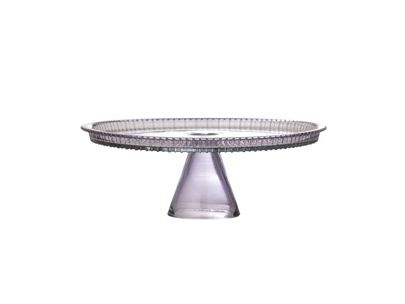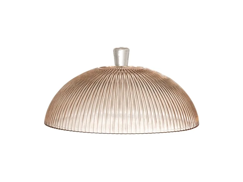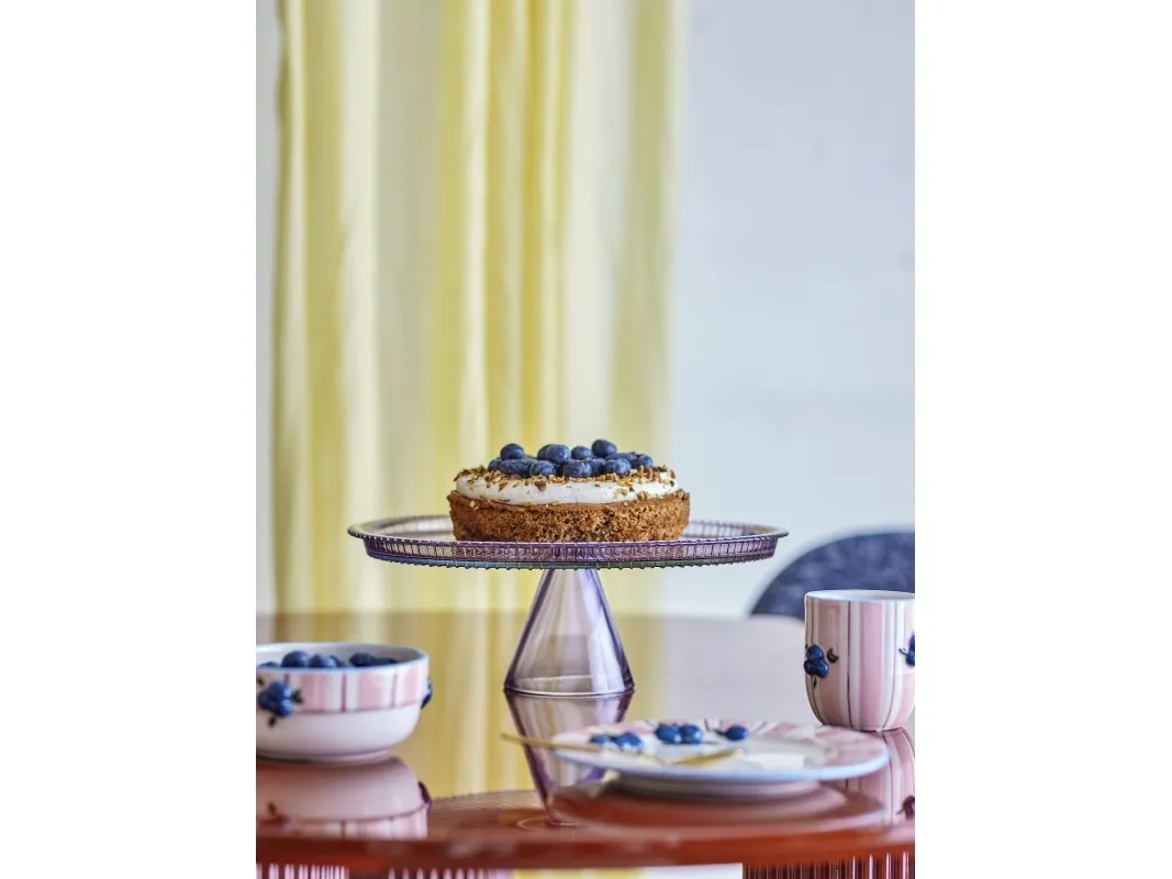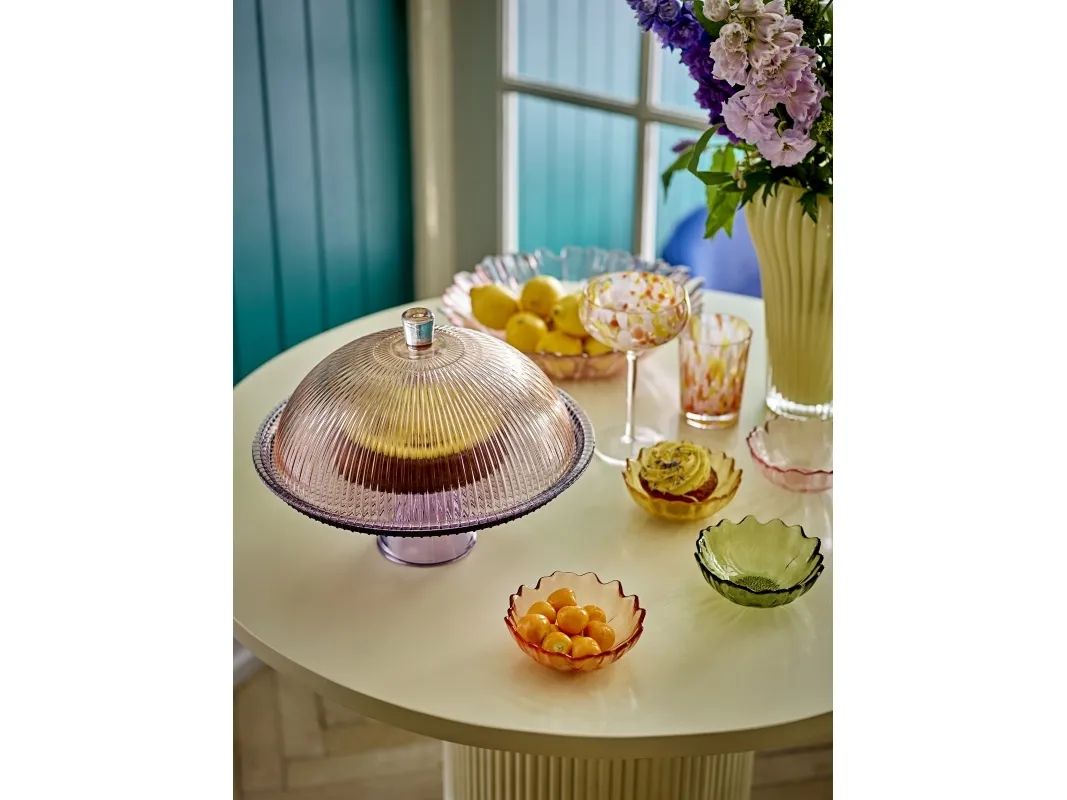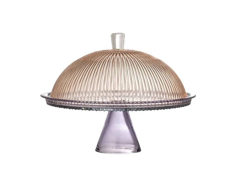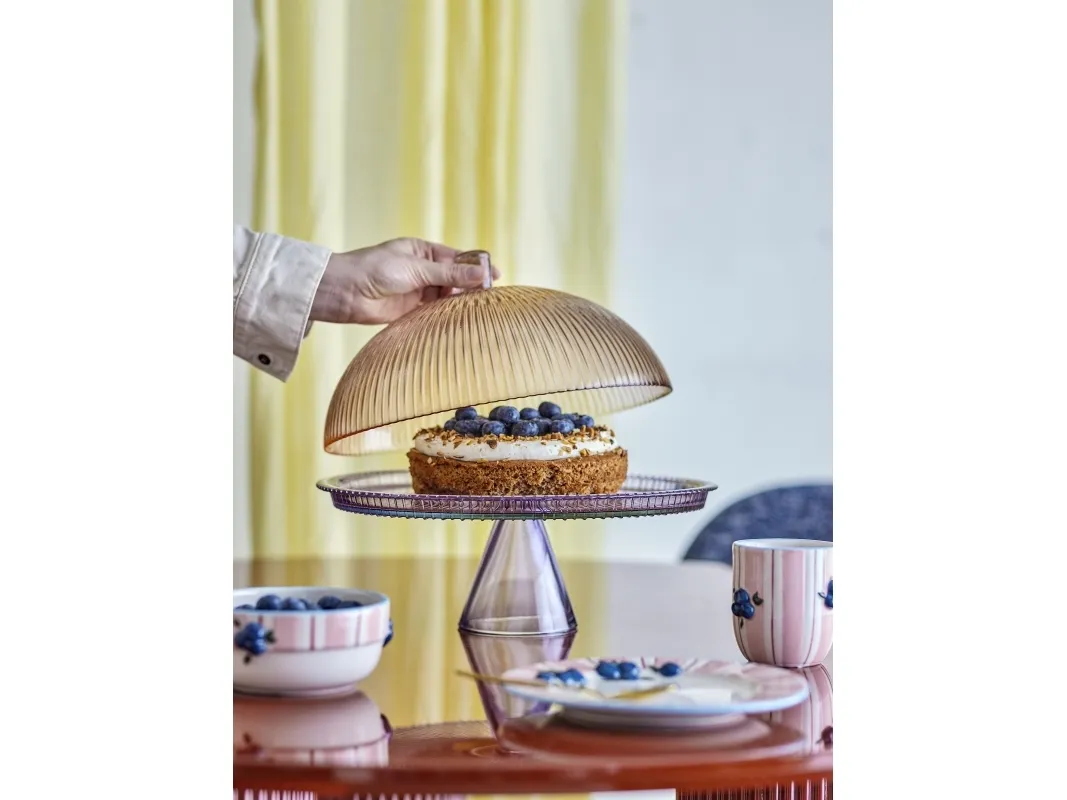 The Tayo Cake Tray w/Dome by Bloomingville is a spray colored glass design with fine vertical ribbing that adds depth and shimmer. The tall conical base and dome lid appear in soft, complementary tones, creating a refined look. A practical and decorative piece for serving or display.
