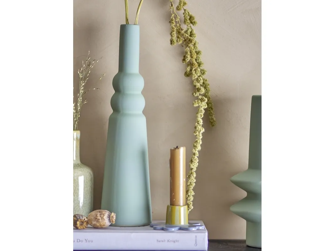 The Isolde Vase is a tall, slender vase with a beautiful matte glaze in a light green shade. The narrow opening makes it perfect for placing a single long-stemmed flower or plant for an elegant look.