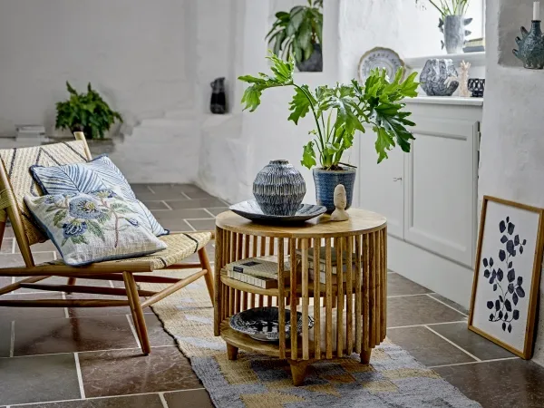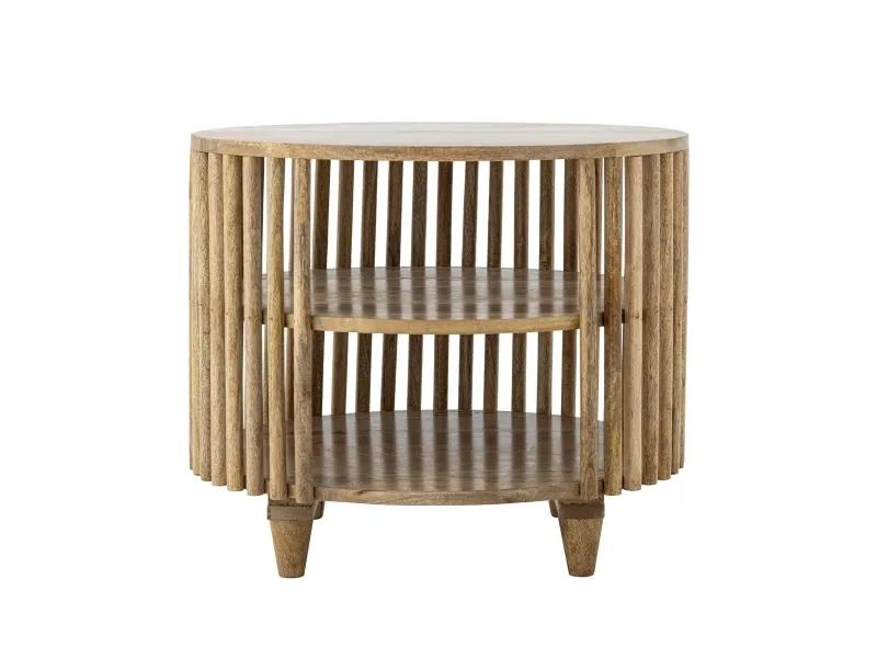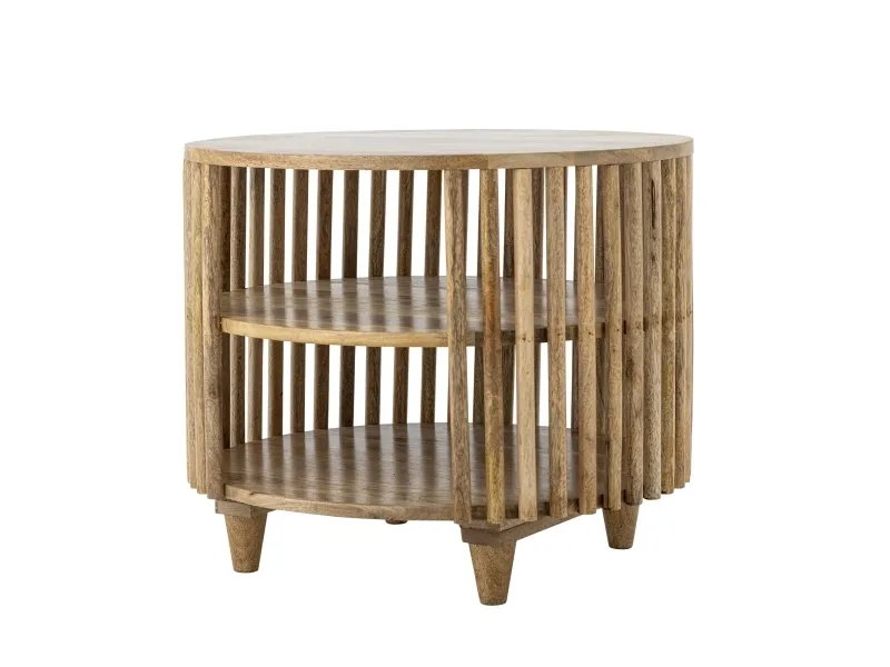 The Sali Coffee Table by Creative Collection is a round table made of FSC®-certified mango wood with a lacquered finish. It features slatted sides, two lower shelves, and tapered legs in a warm brown shade. The product is made of natural materials – variations in color may occur, making each piece unique.
