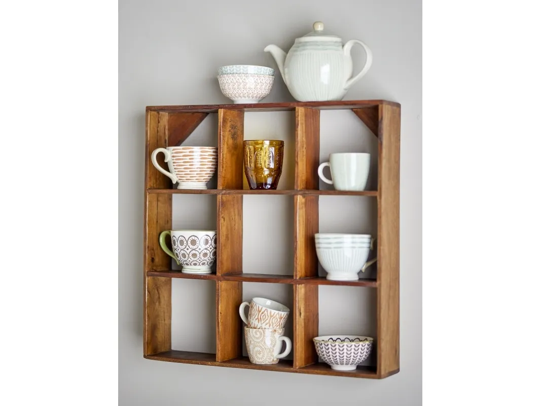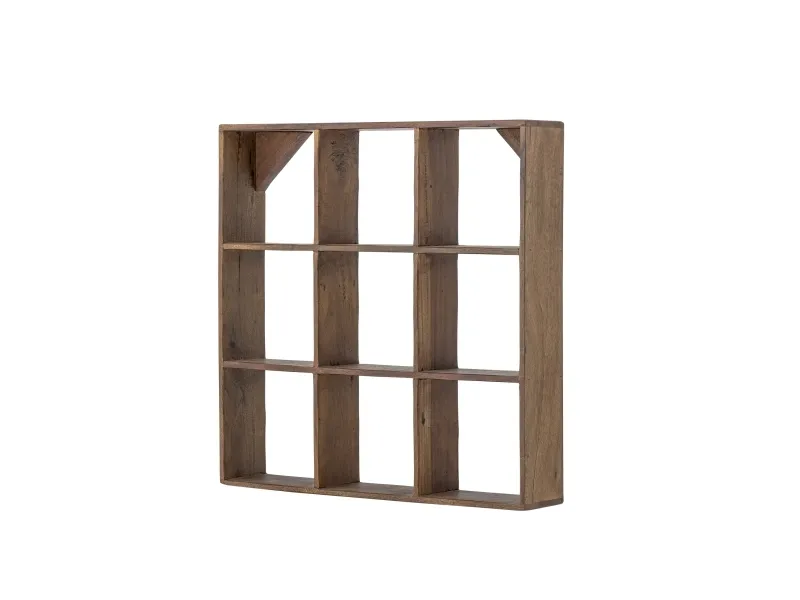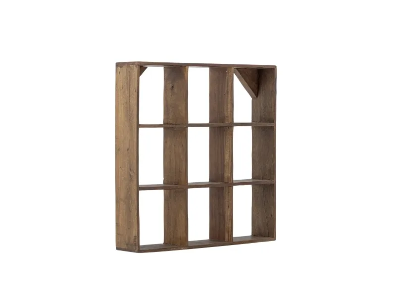 The Tilo Shelf by Creative Collection is a square wall unit crafted from reclaimed wood with a waxed finish. It features nine deep cubbies and diagonal wooden braces at the back. Presented in warm brown tones. The product is made of natural materials – variations in color may occur, making each piece unique.
