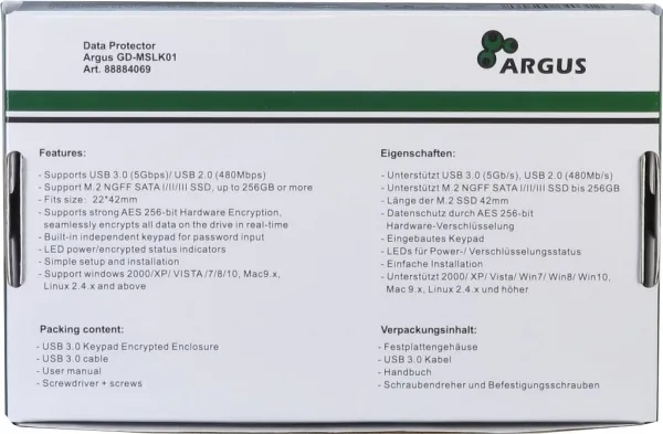 You are in possession of sensitive data? You want that only you and no one else can have access to your data? Then the small, external Argus GD-MSLK01 is the right solution! After mounting a M.2 memory you can comfortably transfer your data and then protect the drive with a 256-bit AES encryption.