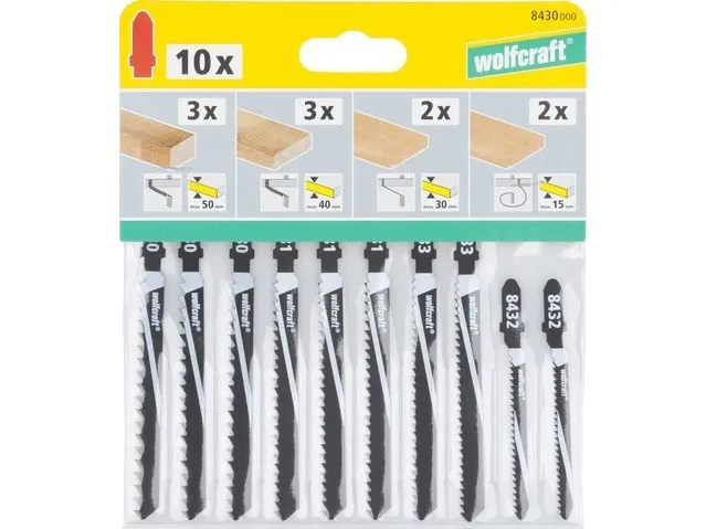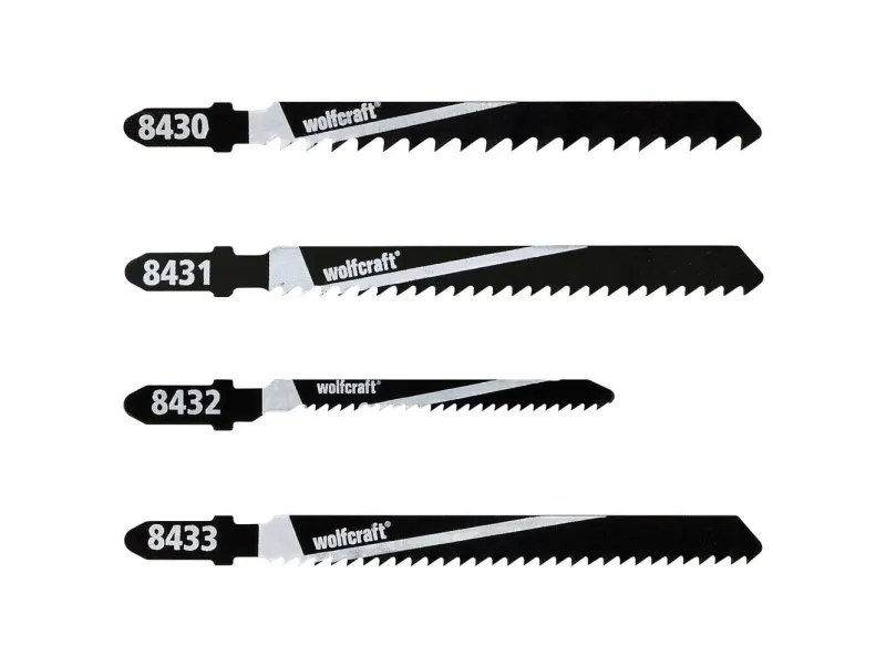 2 HCS jigsaw blades, cutting depth 5 - 40 mm, tooth spacing 2.5 mm 3 HCS jigsaw blades, cutting depth 8 - 40 mm, fast very rough cut, tooth spacing 4 mm 2 HCS jigsaw blades, cutting depth 4 - 15 mm, curved cut, tooth spacing 2 mm 3 HCS jigsaw blades, cutting depth 6 - 40 mm, rough cut, tooth spacing 3 mm