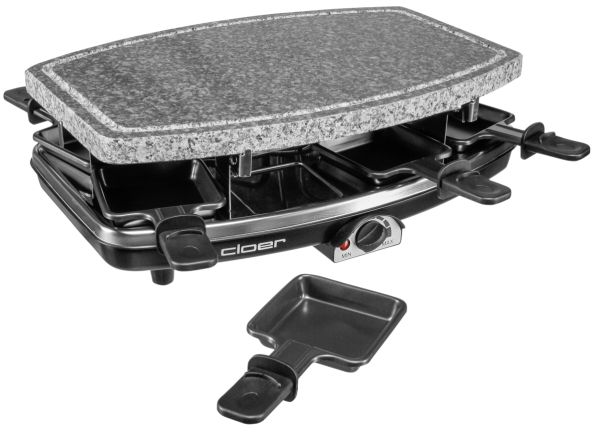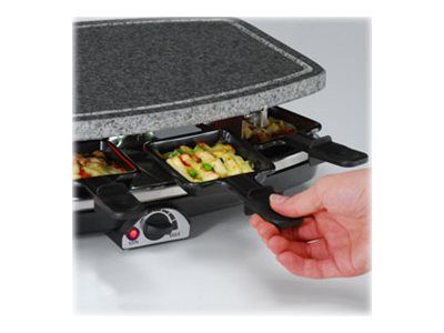 - Irroitettava ja helposti puhdistettava luonnonkivipaistolevy - 8 raclettepannua juustolle ja esimerkiksi vihanneksille - Portaaton lämpötilan säätö - Merkkivalo