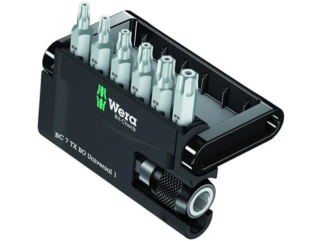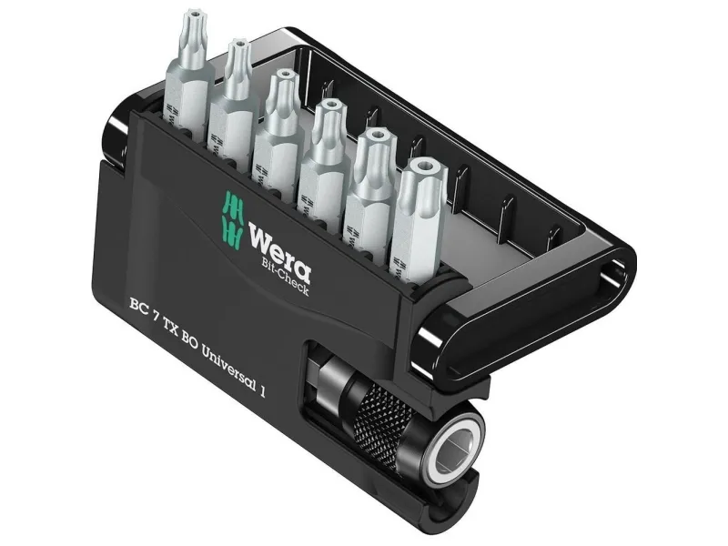 Robust Bit-Check by Wera. Bit-Checks provide a quick overview of the tools available. Bits not needed are simply reinserted into the set and do not get lost. Simple transportation e.g. in the shirt pocket. Includes universal holder for the take-up of bits with 1/4" hexagon head drive as per DIN ISO 1173-C 6.3. Quick-release chuck for rapid bit change. Comes with TORX® BO bits for secure fastening; for universal use.