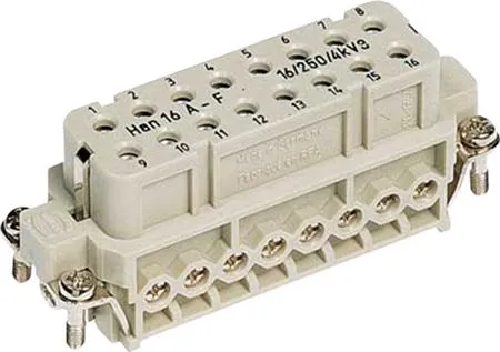 Teollisuusliitin, sarja Han® A - InsertsLiitin , jolla on korkeammat ympäristövaatimukset, korkea mekaaninen turvallisuus myös isku- ja iskukuormituksissa lukituskiinnikkeen avulla. Käytetään: koneenrakennus, tuulivoima, ohjauspaneelien rakentaminen, rautatietekniikka. Valmistajan tyyppimerkintä: Han® A